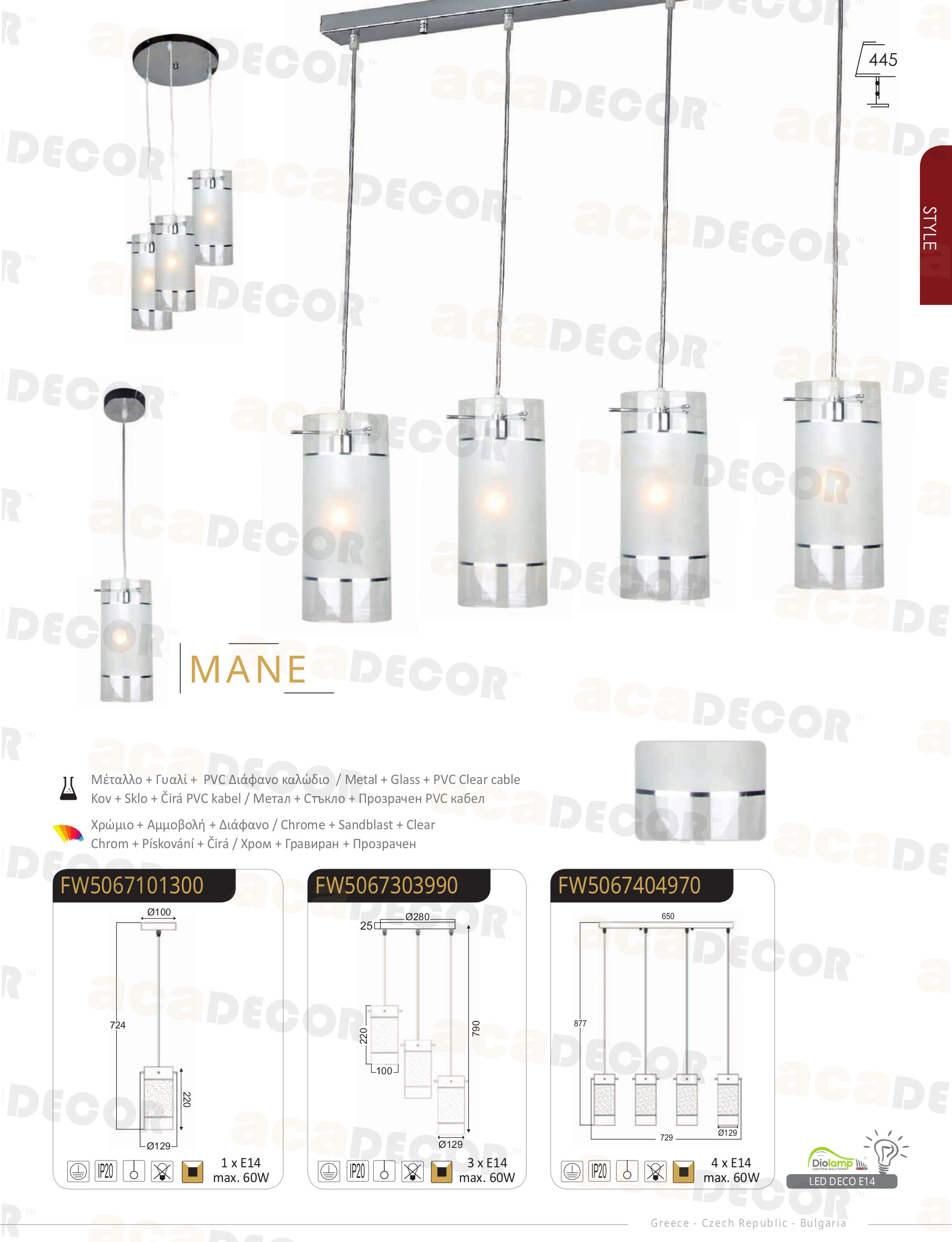 Осветителното тяло FW50674 ще осигури комфорт и естетика във всяко помещение, в което се постави. Цялостната визия и дизайн на лампата и вложените в изработката й материали, като хромиран метал, пясъкоструйно обработено стъкло, прозрачен PVC кабел, ще допринесат за един неповторим стил. Благодарение на дългогодишния опит, качествените материали и строгия контрол на качеството на изработка на производителя ACA-Lighting (Гърция), FW50674 е на високо европейско ниво.