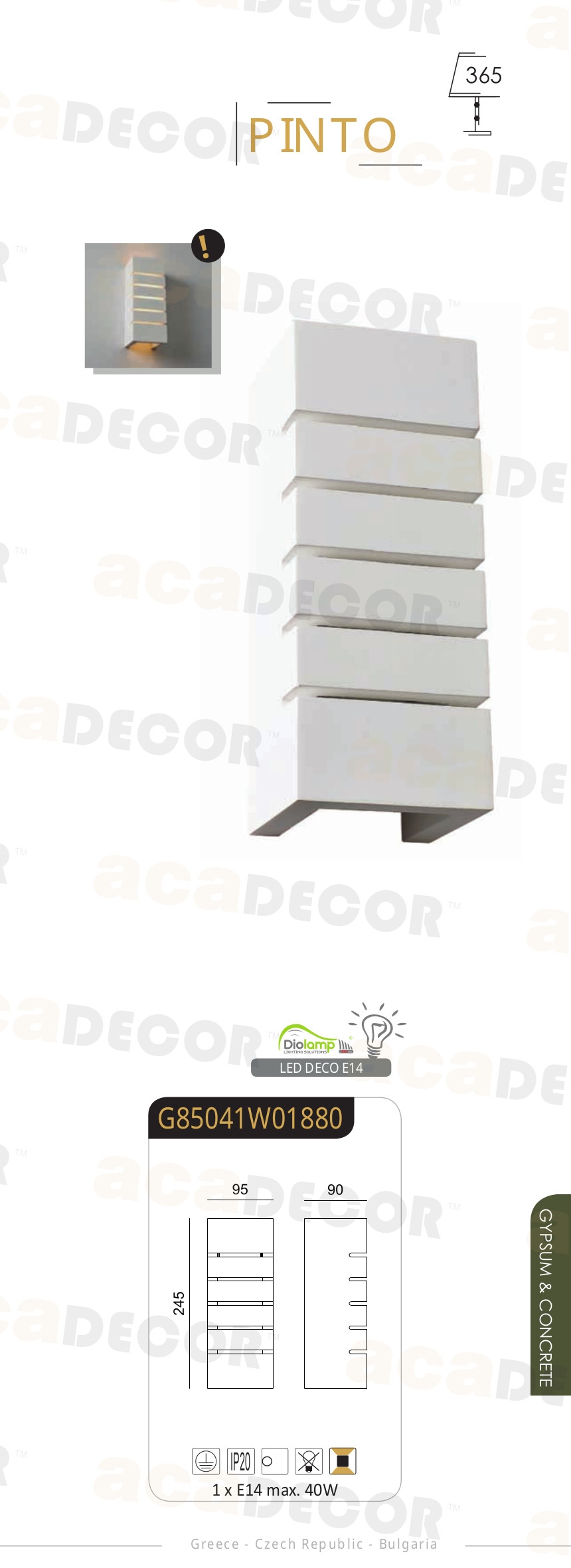 Осветителното тяло G85041W ще осигури комфорт и естетика във всяко помещение, в което се постави. Цялостната визия и дизайн на лампата и вложените в изработката й материали, като гипс в естествен цвят, ще допринесат за един неповторим стил. Благодарение на дългогодишния опит, качествените материали и строгия контрол на качеството на изработка на производителя ACA-Lighting (Гърция), G85041W е на високо европейско ниво.