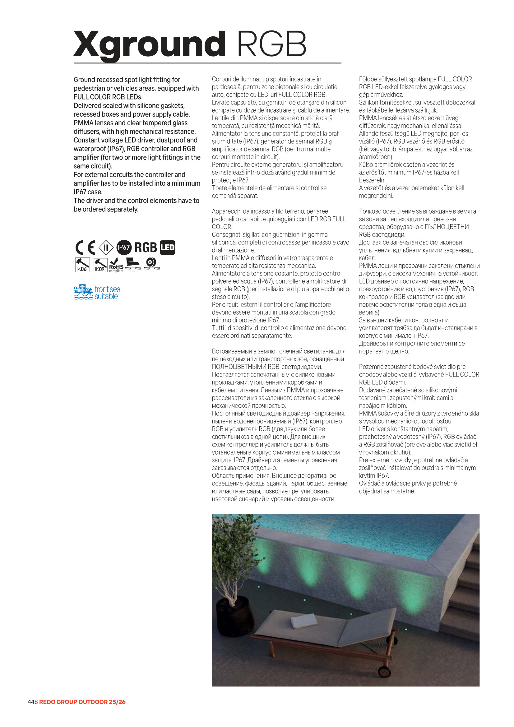 корпус от неръждаема стомана, PMMA лещи и прозрачни закалени стъклени дифузори, с висока механична устойчивост, оборудвано с ПЪЛНОЦВЕТНИ RGB светодиоди, драйверът и контролните елементи се поръчват отделно, 12VDC
