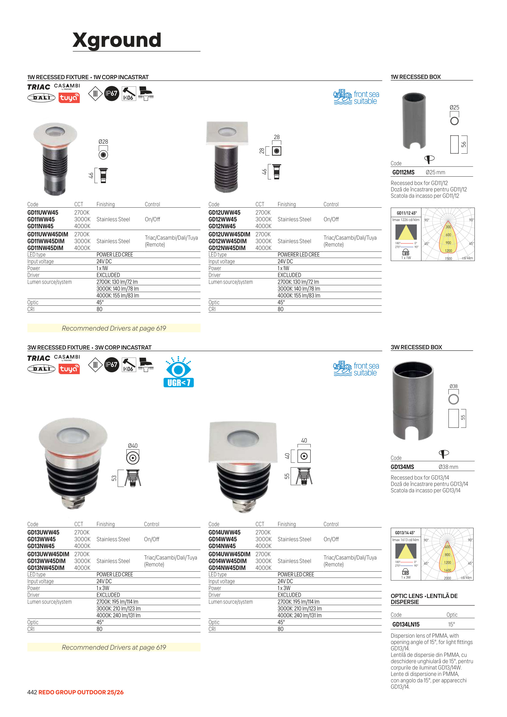 Лед външна лампа, луничка / луна GD12WW45 ще осигури комфорт и естетика във всяко помещение, в което се постави. Цялостната визия и дизайн на led лампата и вложените в изработката й материали, като екструдиран анодизиран и пасивиран алуминий, рамка от неръждаема стомана AISI 316, доставя се без драйвър, запечатан със силиконови уплътнения, кабелна муфа PG7 от неръждаема стомана и захранващ кабел, покрит с гума, с дължина 1 m, 24 VDC, ще допринесат за един неповторим стил. Благодарение на дългогодишния опит в производството на лед осветление, качествените материали и строгия контрол на качеството на изработка на дизайнерската линия Redo Outdoor на производителя Redo (Румъния), GD12WW45 е на високо европейско ниво.