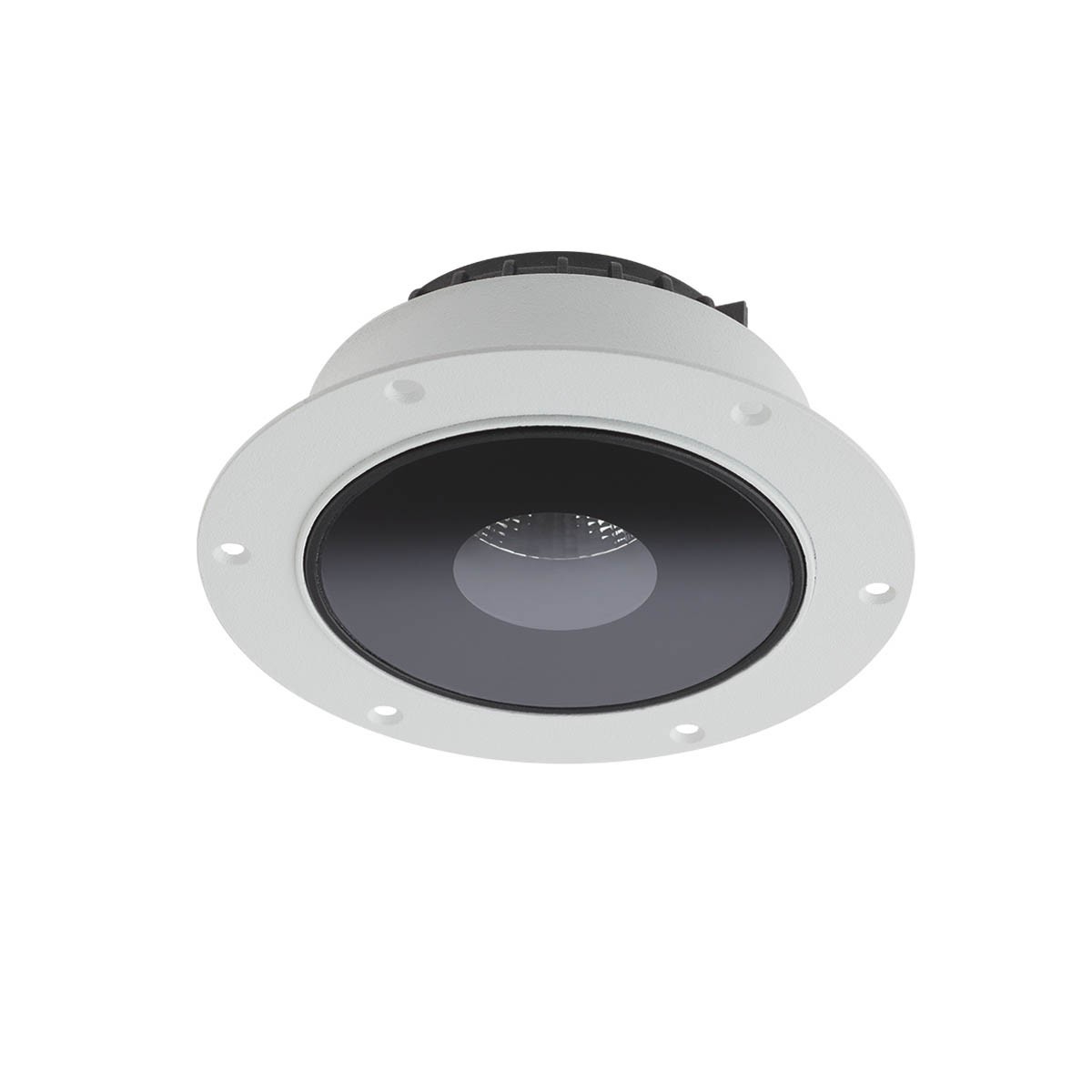 корпус от лят алуминий, електростатично боядисан в матово черен цвят, рефлектор от сребрист фасетиран поликарбонат, разсейвател от сатенирано стъкло с кръгъл централен прозрачен елемент