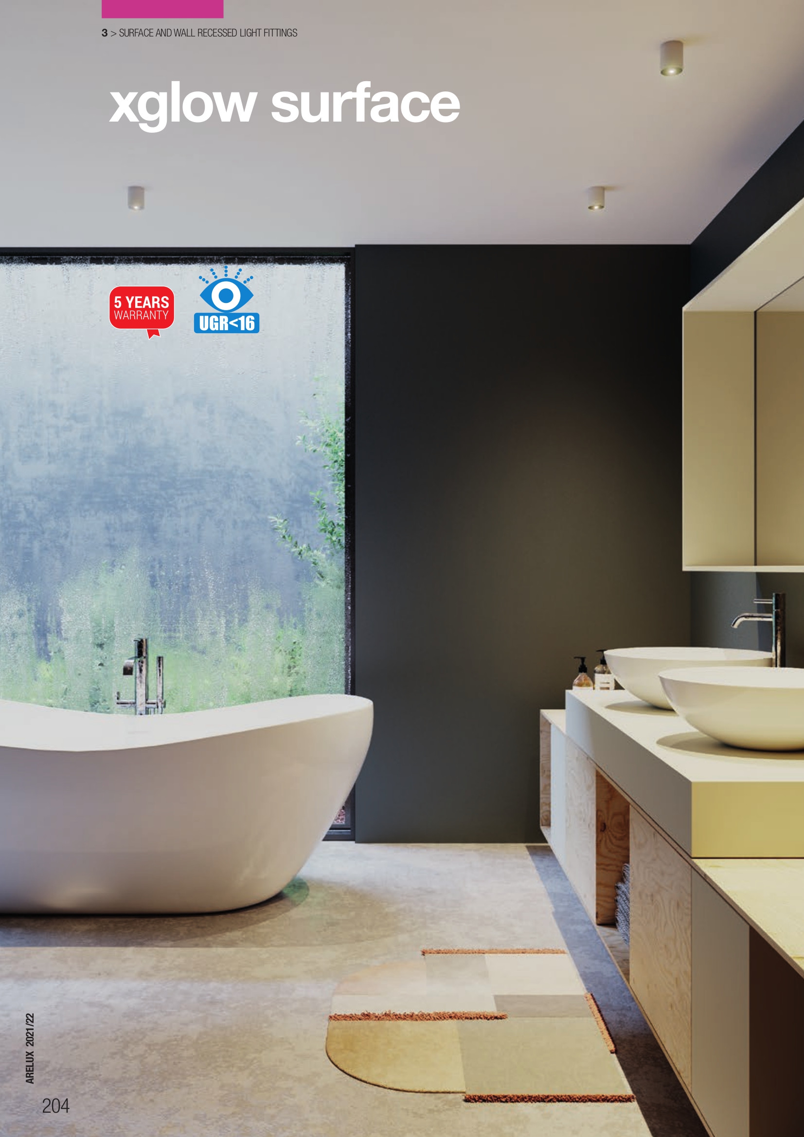 корпус от отлят алуминий в матово бял цвят, рефлектор от сребрист сатениран поликарбонат, разсейвател от сатенирано стъкло с кръгъл централен прозрачен елемент