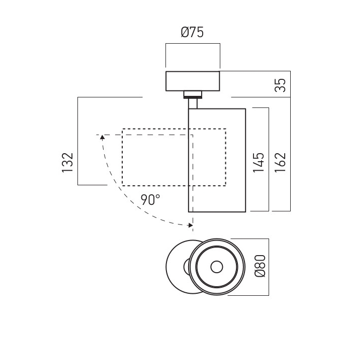 екструдиран алуминий в цвят пясъчно черно, декоративен пръстен от отлят под налягане алуминий в черно, шарнир позволяващ промяна на ориентацията 0° - 355° хоризонтално и 0° - 90° вертикално, оптична система с леща FRESNEL от PMMA с 38° ъгъл на дисперсия