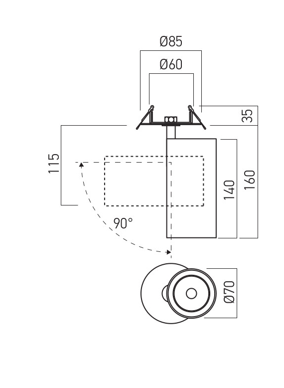 екструдиран алуминий в цвят пясъчно черноо, декоративен пръстен от отлят под налягане алуминий в черно, промяна на ориентацията 0° - 355° хоризонтално и 0° - 90° вертикално, оптична система с леща FRESNEL от PMMA с 38° ъгъл на дисперсия