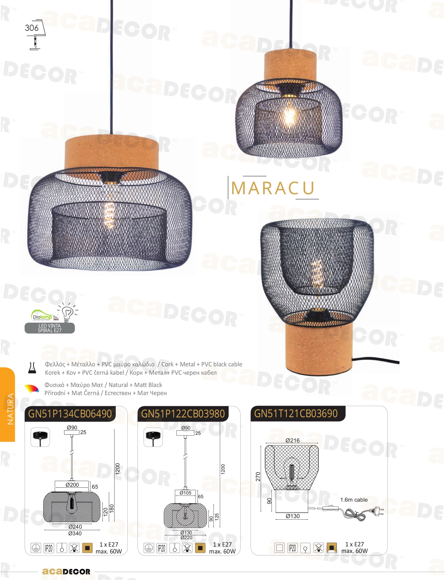 Осветителното тяло GN51P134CB ще осигури комфорт и естетика във всяко помещение, в което се постави. Цялостната визия и дизайн на лампата и вложените в изработката й материали, като корк, метал в черен цвят, ще допринесат за един неповторим стил. Благодарение на дългогодишния опит, качествените материали и строгия контрол на качеството на изработка на производителя ACA-Lighting (Гърция), GN51P134CB е на високо европейско ниво.