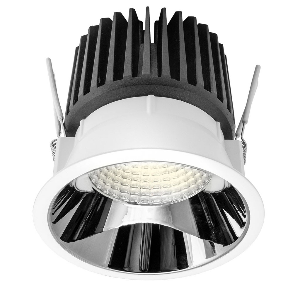 радиатор от лят алуминий в черен цвят, рефлектор от фасетиран поликарбонат с висок гланц, дифузьор от прозрачен поликарбонат, декоративен пръстен от хромиран поликарбонат