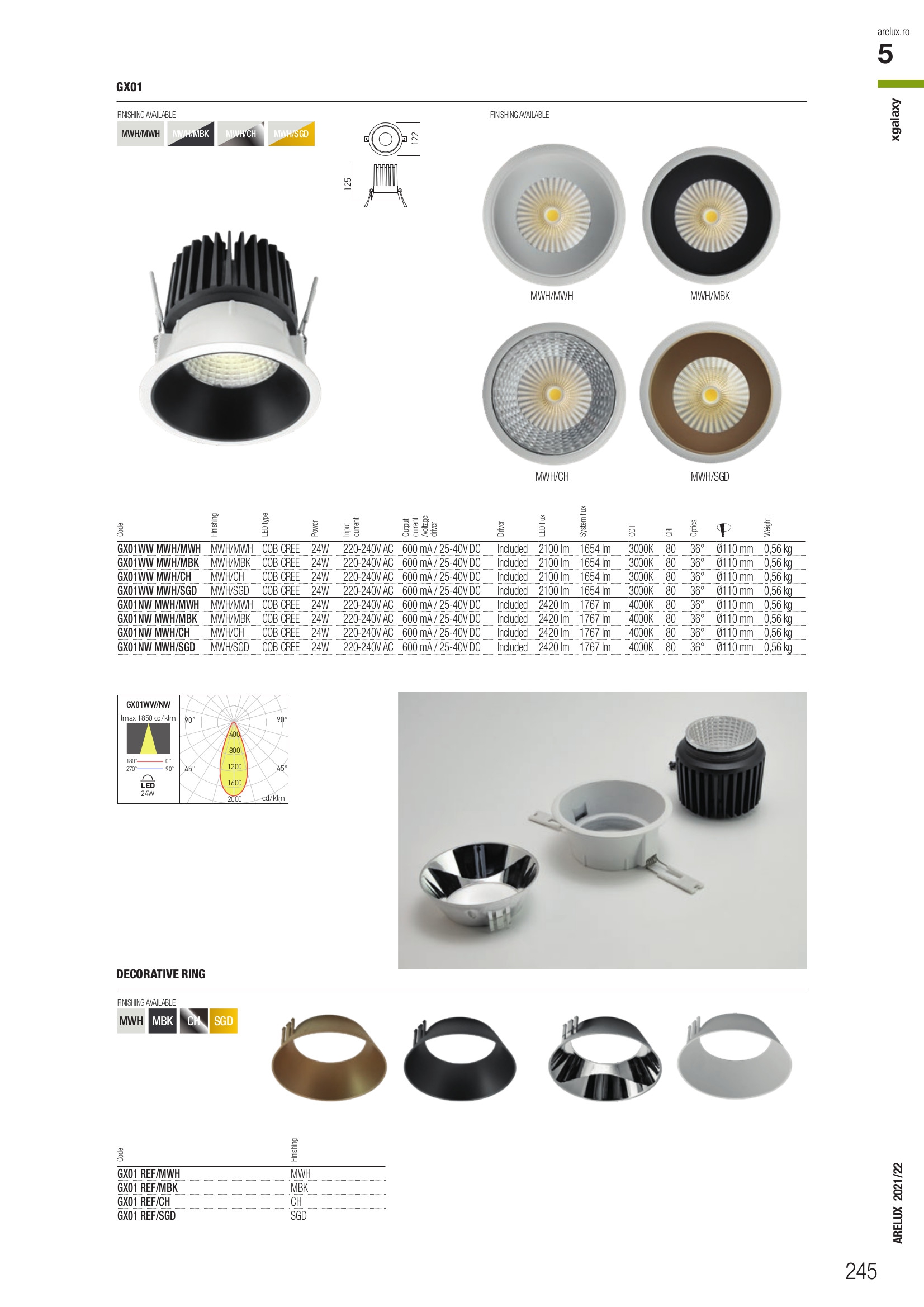 Осветителното тяло GX01NW MWH/CH ще осигури комфорт и естетика във всяко помещение, в което се постави. Цялостната визия и дизайн на лампата и вложените в изработката й материали, като радиатор от лят алуминий в черен цвят, рефлектор от фасетиран поликарбонат с висок гланц, дифузьор от прозрачен поликарбонат, декоративен пръстен от хромиран поликарбонат, ще допринесат за един неповторим стил. Благодарение на дългогодишния опит, качествените материали и строгия контрол на качеството на изработка на дизайнерската линия Redo Arelux на производителя Redo (Румъния), GX01NW MWH/CH е на високо европейско ниво.