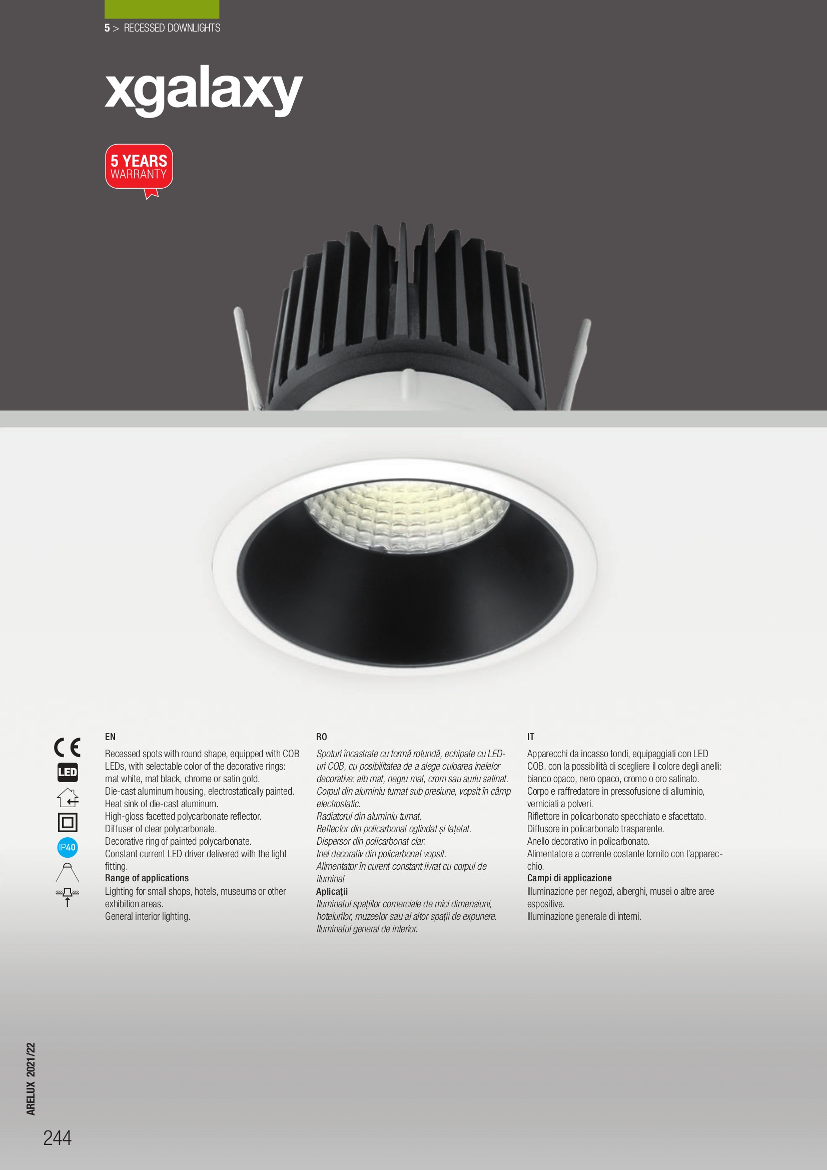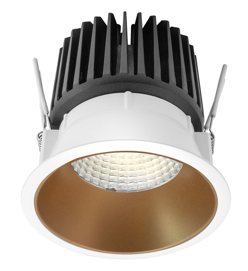 радиатор от лят алуминий в черен цвят, рефлектор от фасетиран поликарбонат с висок гланц, дифузьор от прозрачен поликарбонат, декоративен пръстен от поликарбонат в цвят златен сатен