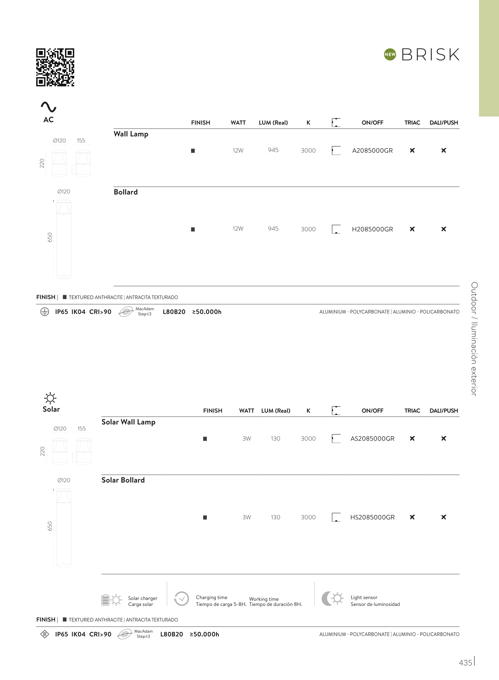 Лед външна лампа H2085000GR ще осигури комфорт и естетика във всяко помещение, в което се постави. Цялостната визия и дизайн на led лампата и вложените в изработката й материали, като алуминий в текстурирано черно, полимер, ще допринесат за един неповторим стил. Благодарение на дългогодишния опит в производството на лед осветление, качествените материали и строгия контрол на качеството на изработка на производителя ACB (Испания), H2085000GR е на високо европейско ниво.