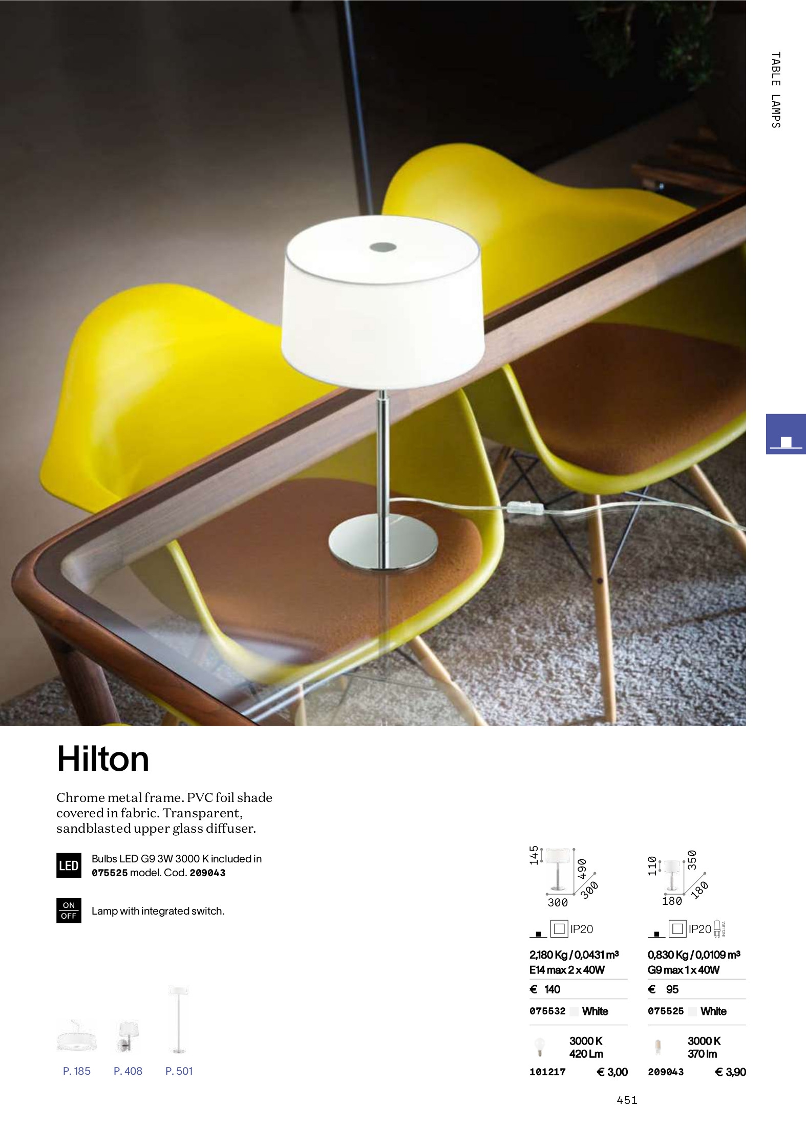 Стилът и естетиката на интериора ще се обогатят благодарение, както на цялостната визия, стил и дизайн на осветителното тяло, така и на вложените от производителя в изработката на HILTON TL2 BIANCO, качествени материали, като: хромиран метал, абажур от PVC фолио, покрит с текстил в бяло, прозрачен, пясъкоструйно обработен стъклен долен дифузер, захранващ кабел и ключ ON/OFF.