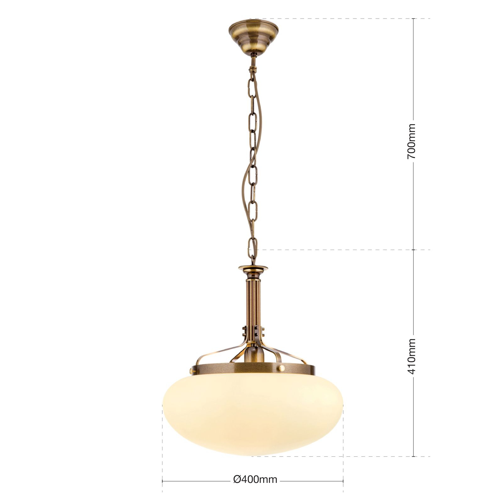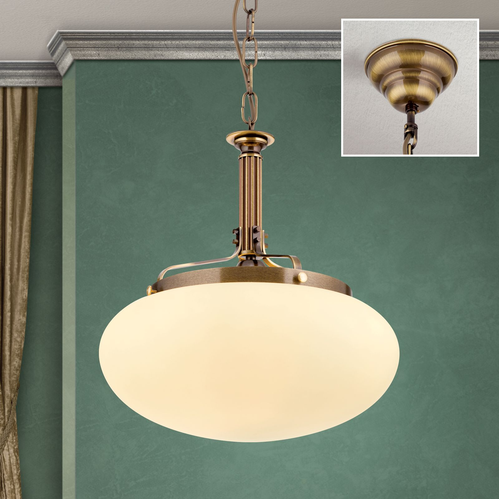 Стилът и естетиката на обстановката ще се обогатят благодарение, както на цялостната визия и дизайн на осветителното тяло, така и на вложените в изработката му, качествени материали, като: масивен месинг с покритие от античен месинг, стъкло в цвят шампанско мат.