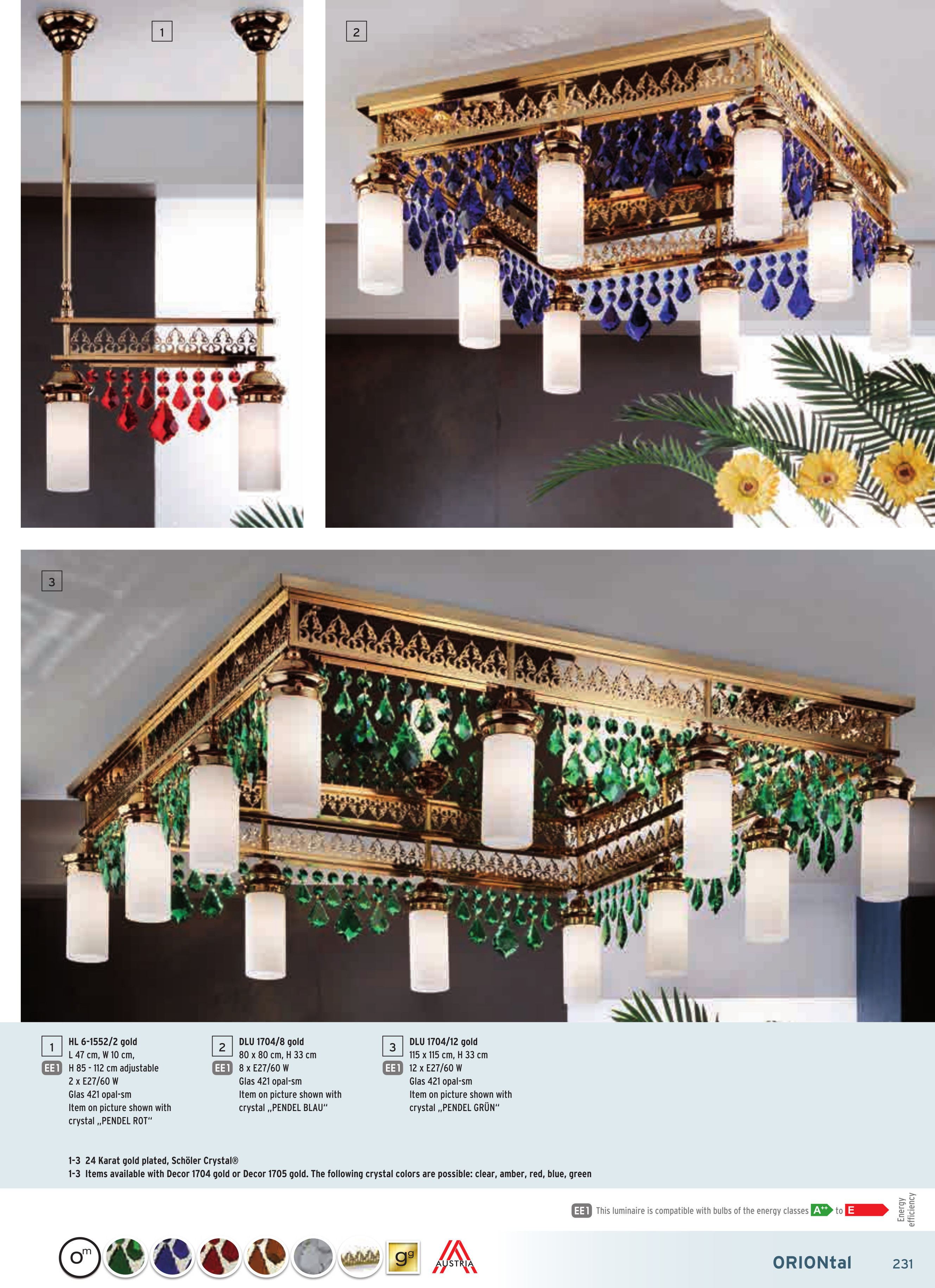 Осветителното тяло HL 6-1552/2 gold/Pendel rot ще осигури комфорт и естетика във всяко помещение, в което се постави. Цялостната визия и дизайн на лампата и вложените в изработката й материали, като масивен месинг с 24-каратово златно покритие, кристални висулки в червен цвят SCHÖLER CRYSTAL®, ориенталски дизайн, ще допринесат за един неповторим стил. Благодарение на дългогодишния опит, качествените материали и строгия контрол на качеството на изработка на производителя Orion (Австрия), HL 6-1552/2 gold/Pendel rot е на високо европейско ниво.