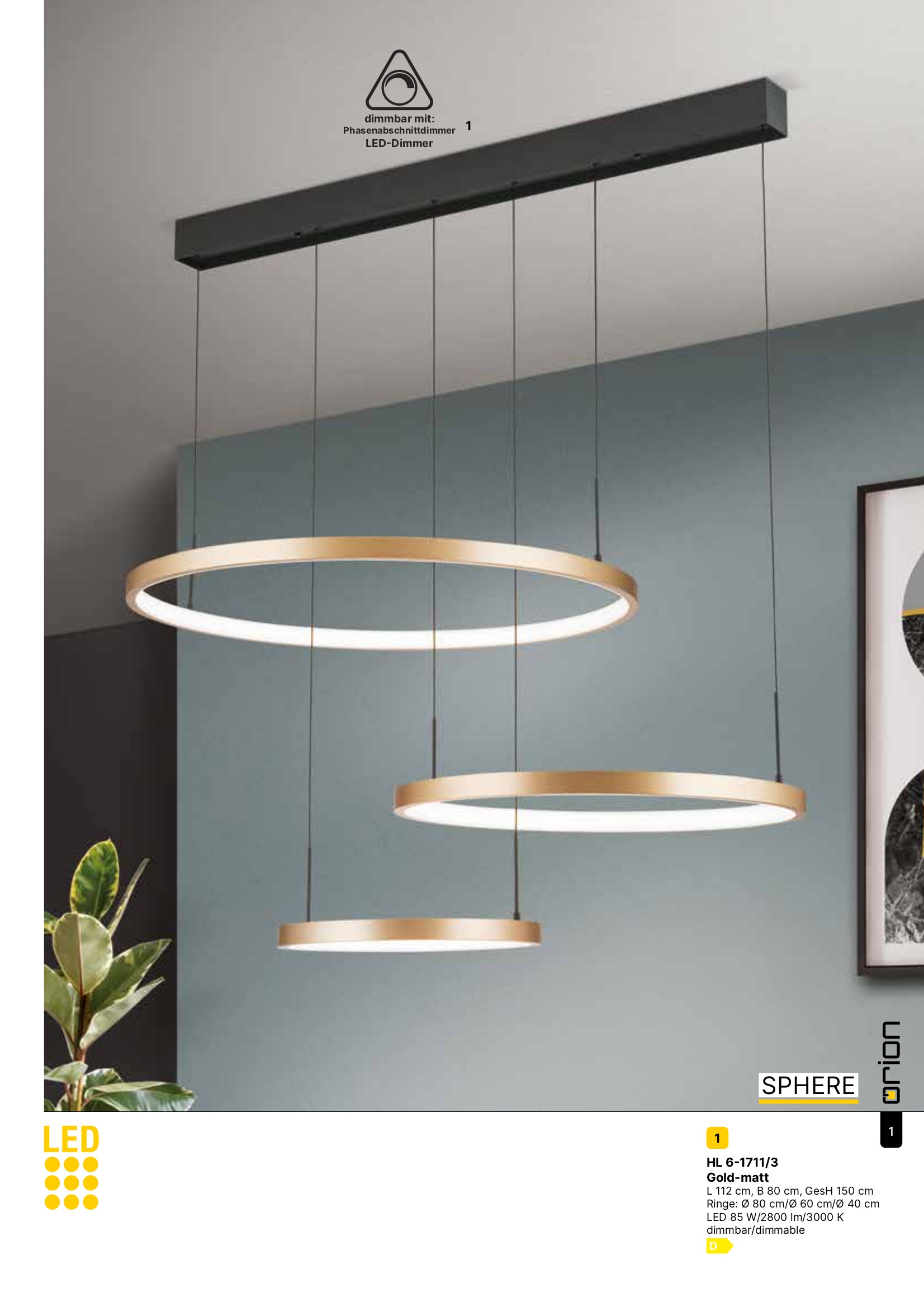 Лед полилей HL 6-1711/3 gold-matt (LED85W/2800lm/300 ще осигури комфорт и естетика във всяко помещение, в което се постави. Цялостната визия и дизайн на led лампата и вложените в изработката й материали, като стомана в цвят златен мат, дифузер от бял силикон, стомана в черен цвят, ще допринесат за един неповторим стил. Благодарение на дългогодишния опит в производството на лед осветление, качествените материали и строгия контрол на качеството на изработка на производителя Orion (Австрия), HL 6-1711/3 gold-matt (LED85W/2800lm/300 е на високо европейско ниво.