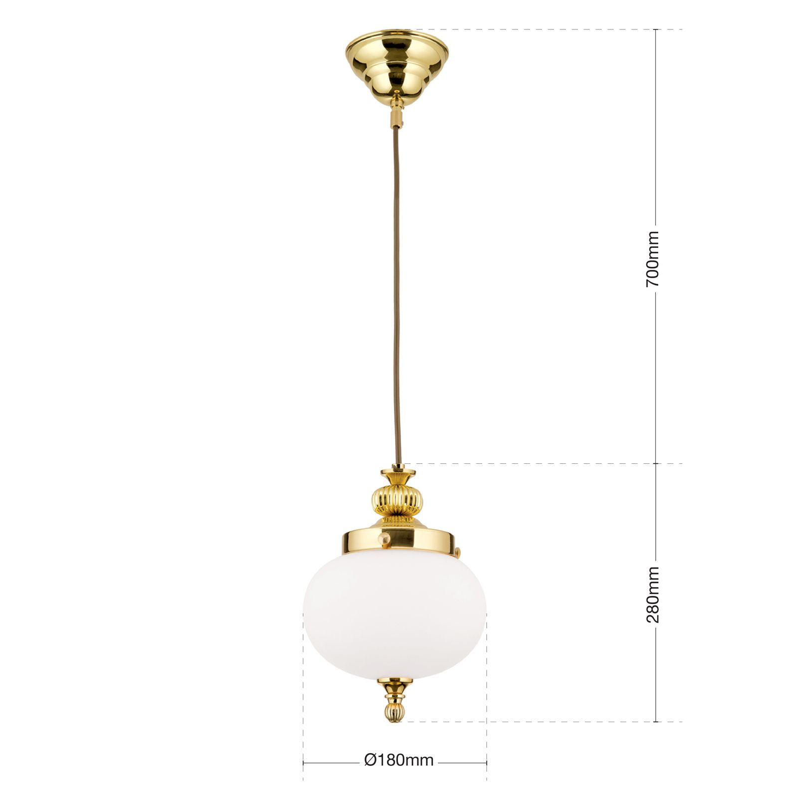 Стилът и естетиката на обстановката ще се обогатят благодарение, както на цялостната визия и дизайн на осветителното тяло, така и на вложените в изработката му, качествени материали, като: масивен месинг с покритие от блестящ месинг, стъкло в цвят бял опал мат.