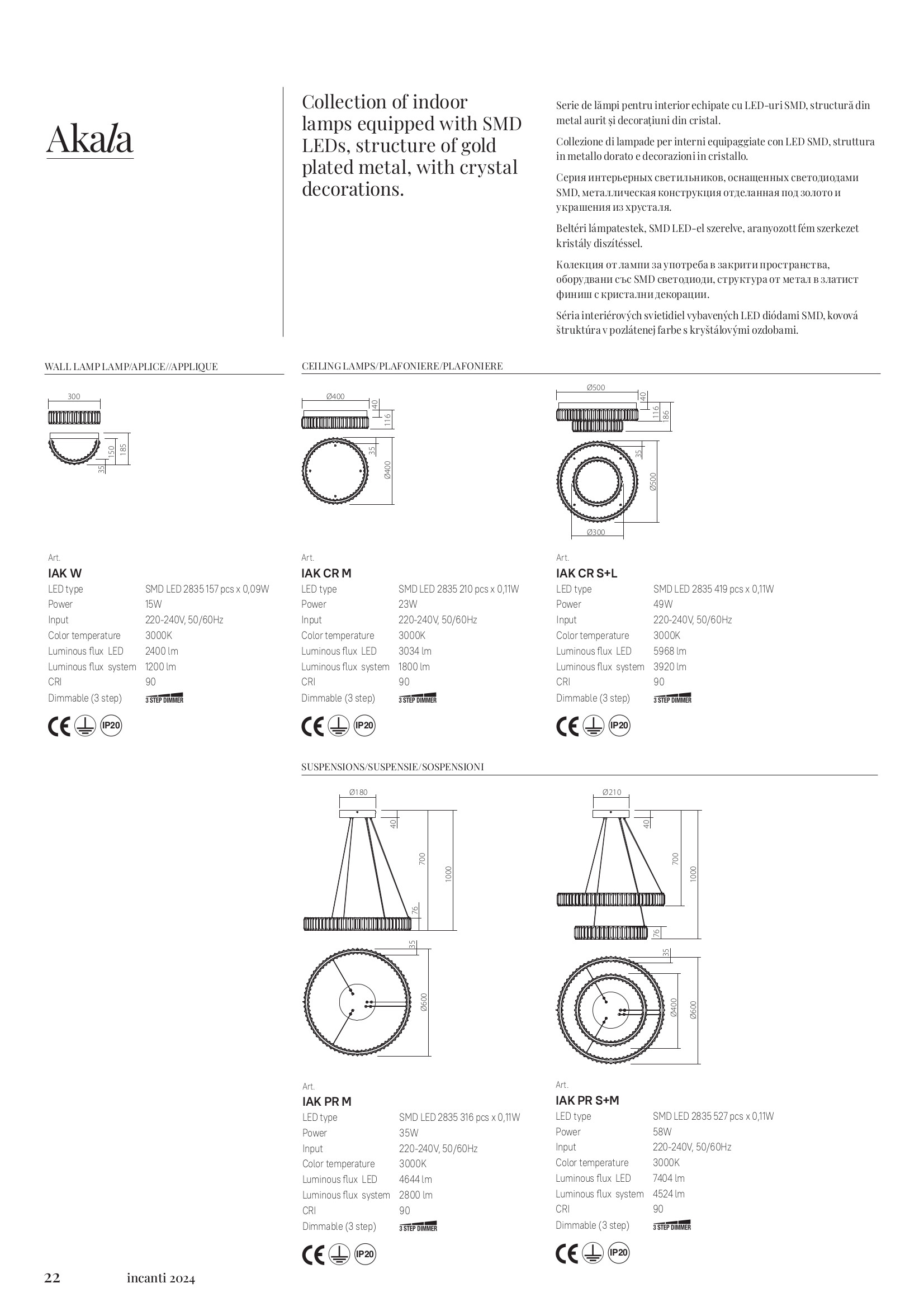 Осветителното тяло IAK CR M ще осигури комфорт и естетика във всяко помещение, в което се постави. Цялостната визия и дизайн на лампата и вложените в изработката й материали, като метал в цвят злато, кристални призми, ще допринесат за един неповторим стил. Благодарение на дългогодишния опит, качествените материали и строгия контрол на качеството на изработка на дизайнерската линия Redo Incanti на производителя Redo (Румъния), IAK CR M е на високо европейско ниво.
