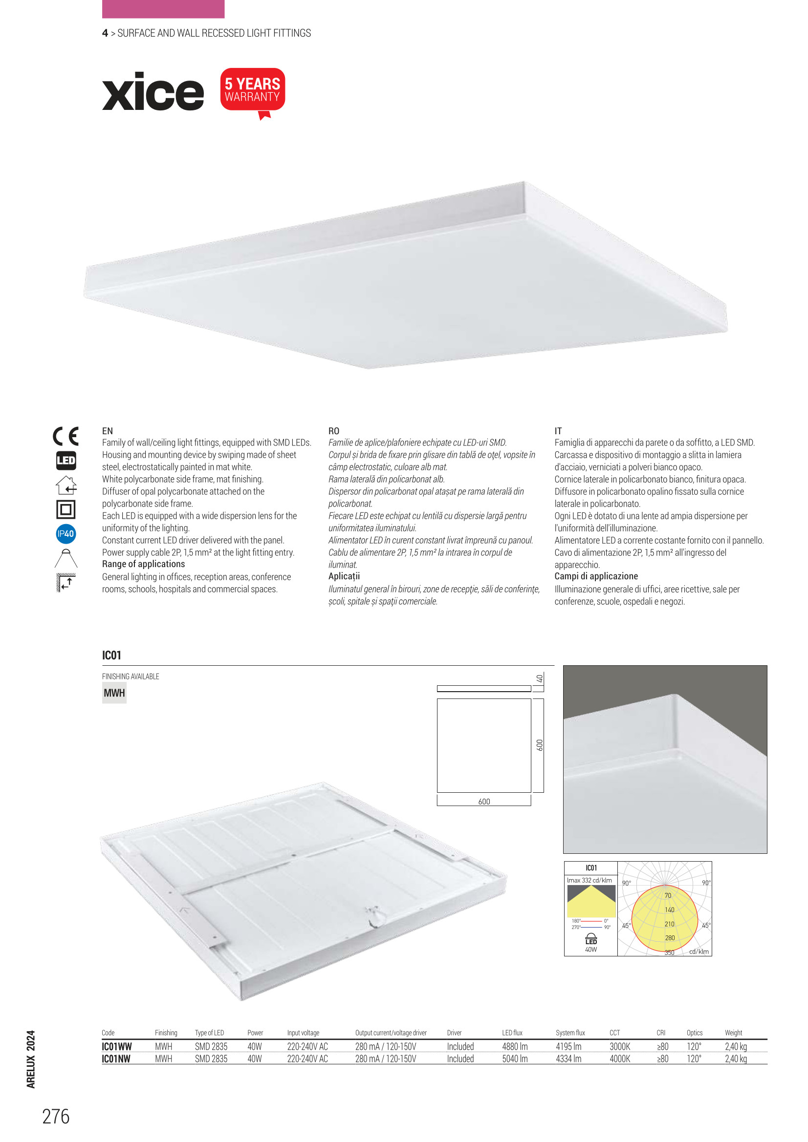 Лед плафон IC01NW ще осигури комфорт и естетика във всяко помещение, в което се постави. Цялостната визия и дизайн на led лампата и вложените в изработката й материали, като стомана в матово бяло, странична рамка от полимер в матово бяло, дифузьор от опалово бял полистерен, защитна система срещу падане със стоманена тел, ще допринесат за един неповторим стил. Благодарение на дългогодишния опит в производството на лед осветление, качествените материали и строгия контрол на качеството на изработка на дизайнерската линия Redo Arelux на производителя Redo (Румъния), IC01NW е на високо европейско ниво.
