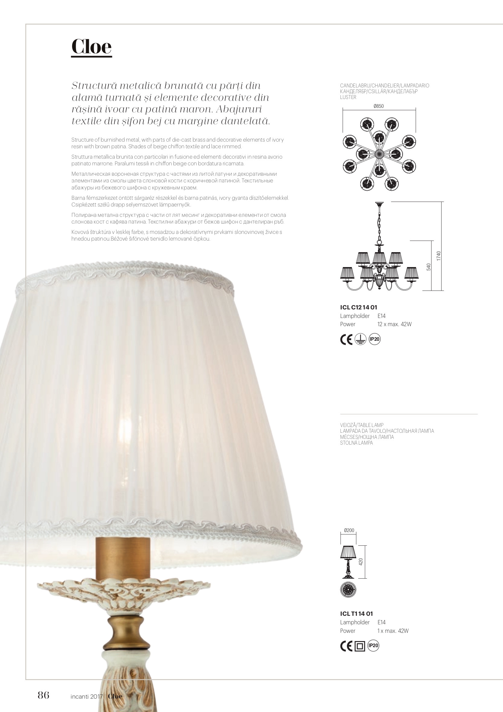 Стилът и естетиката на интериора ще се обогатят благодарение, както на цялостната визия, стил и дизайн на осветителното тяло, така и на вложените от производителя в изработката на ICL T1 14 01, качествени материали, като: полиран метал с детайли от отлят месинг, декоративни елементи в цвят слонова кост с кафява патина, текстилен абажур от светлобежов шифон с дантела по ръба.
