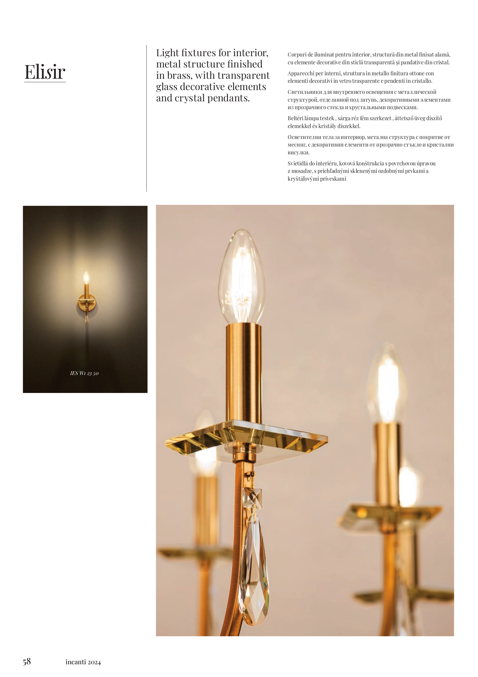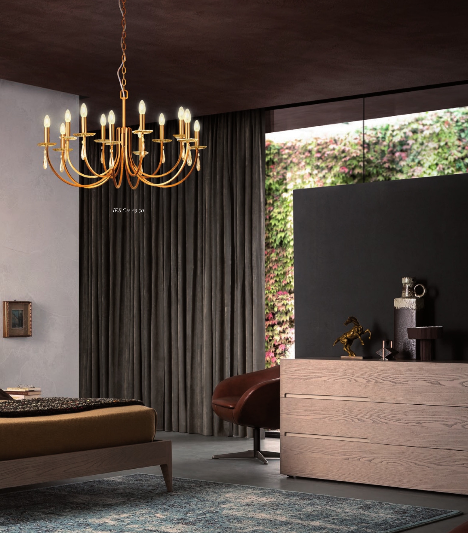 Осветителното тяло IES C12 23 50 ще осигури комфорт и естетика във всяко помещение, в което се постави. Цялостната визия и дизайн на лампата и вложените в изработката й материали, като метал с покритие от златен месинг, декоративни призми от прозрачно стъкло, кристални висулки, ще допринесат за един неповторим стил. Благодарение на дългогодишния опит, качествените материали и строгия контрол на качеството на изработка на дизайнерската линия Redo Incanti на производителя Redo (Румъния), IES C12 23 50 е на високо европейско ниво.