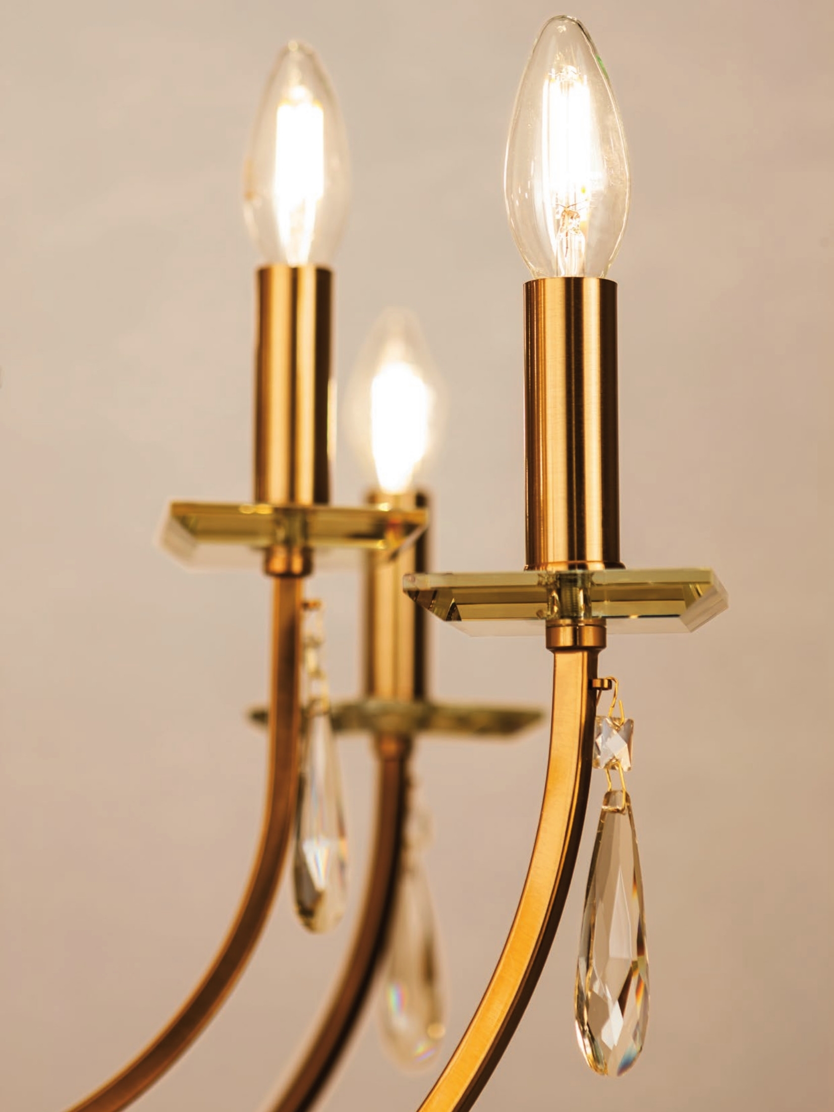 метал с покритие от златен месинг, декоративни призми от прозрачно стъкло, кристални висулки
