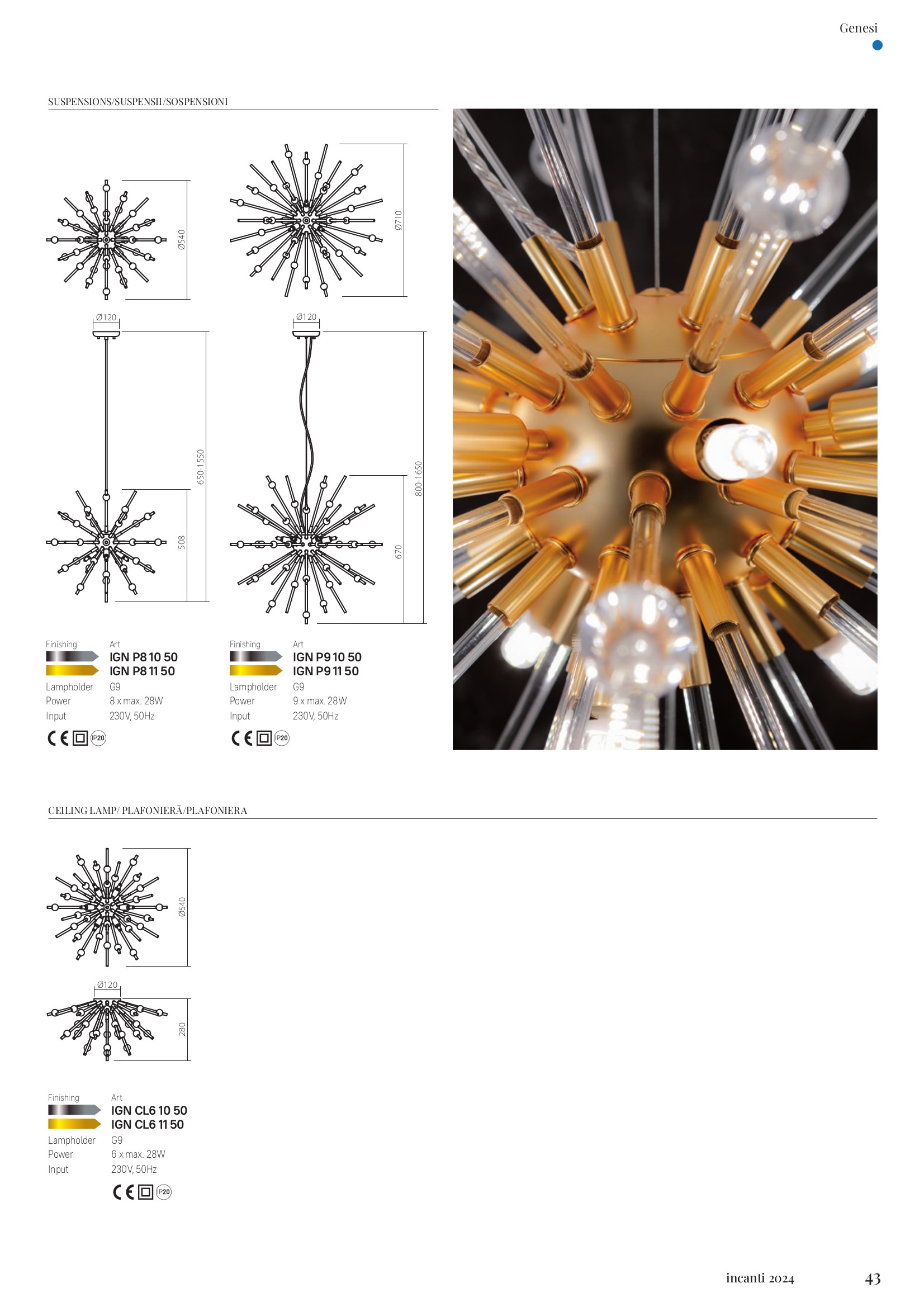 Осветителното тяло IGN CL6 11 50 ще осигури комфорт и естетика във всяко помещение, в което се постави. Цялостната визия и дизайн на лампата и вложените в изработката й материали, като метал с покритие в цвят злато, шпилове от прозрачно стъкло, декоративни сфери от прозрачен акрил, ще допринесат за един неповторим стил. Благодарение на дългогодишния опит, качествените материали и строгия контрол на качеството на изработка на дизайнерската линия Redo Incanti на производителя Redo (Румъния), IGN CL6 11 50 е на високо европейско ниво.