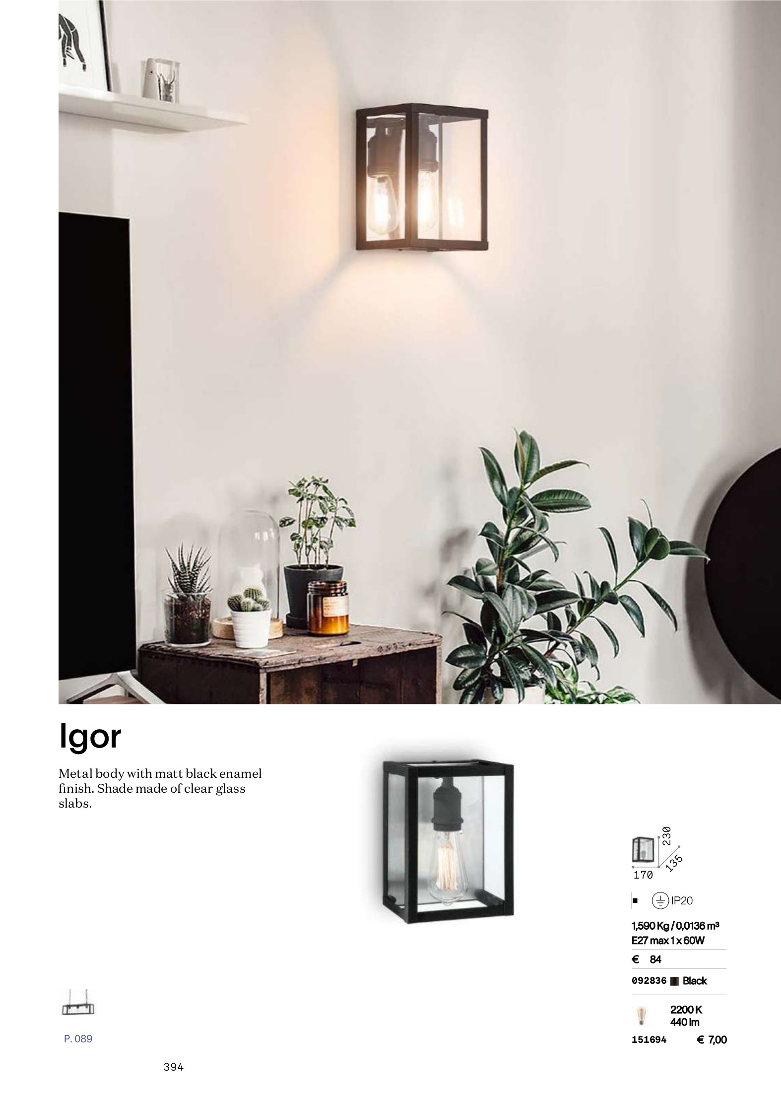 Осветителното тяло IGOR AP1 NERO ще осигури комфорт и естетика във всяко помещение, в което се постави. Цялостната визия и дизайн на лампата и вложените в изработката й материали, като емайлиран метал в цвят черен мат, прозрачно стъкло, ще допринесат за един неповторим стил. Благодарение на дългогодишния опит, качествените материали и строгия контрол на качеството на изработка на производителя Ideal-Lux (Италия), IGOR AP1 NERO е на високо европейско ниво.