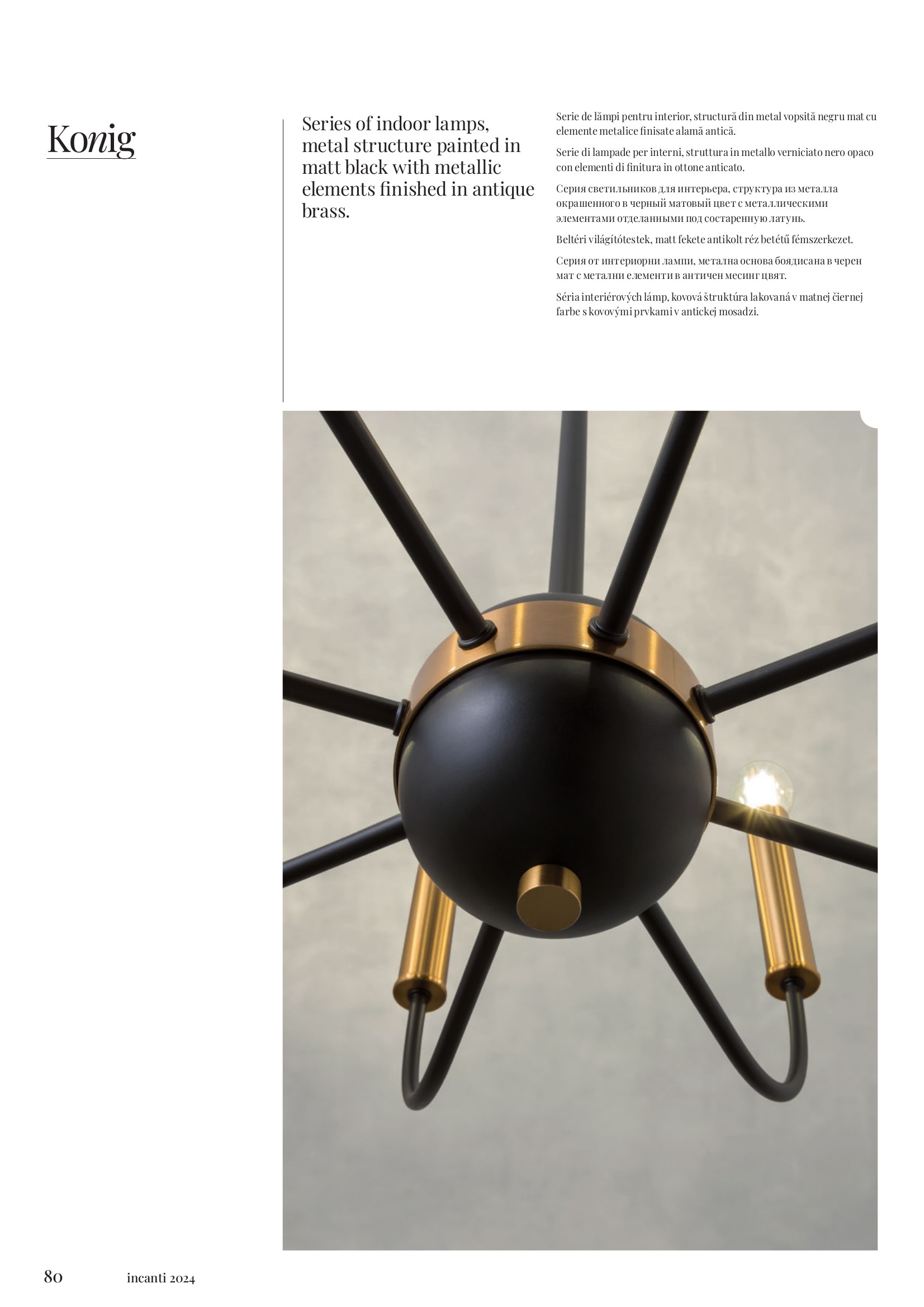 Осветителното тяло IKN C10 06 12 ще осигури комфорт и естетика във всяко помещение, в което се постави. Цялостната визия и дизайн на лампата и вложените в изработката й материали, като метал в цвят черен мат, елементи в цвят античен месинг, ще допринесат за един неповторим стил. Благодарение на дългогодишния опит, качествените материали и строгия контрол на качеството на изработка на дизайнерската линия Redo Incanti на производителя Redo (Румъния), IKN C10 06 12 е на високо европейско ниво.