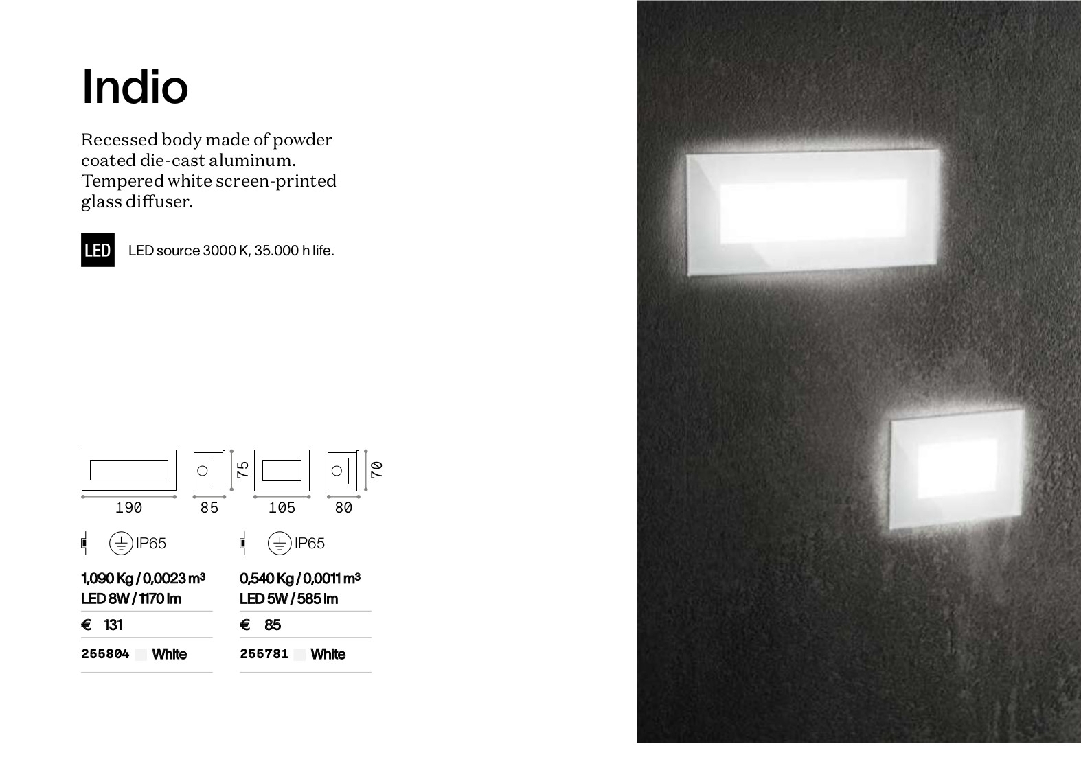 Осветителното тяло INDIO Fl 8W RECESSED ще осигури комфорт и естетика във всяко помещение, в което се постави. Цялостната визия и дизайн на лампата и вложените в изработката й материали, като лят алуминий с прахово нанесено покритие в бял цвят, закалено бяло ситопечатно стъкло, ще допринесат за един неповторим стил. Благодарение на дългогодишния опит, качествените материали и строгия контрол на качеството на изработка на производителя Ideal-Lux (Италия), INDIO Fl 8W RECESSED е на високо европейско ниво.