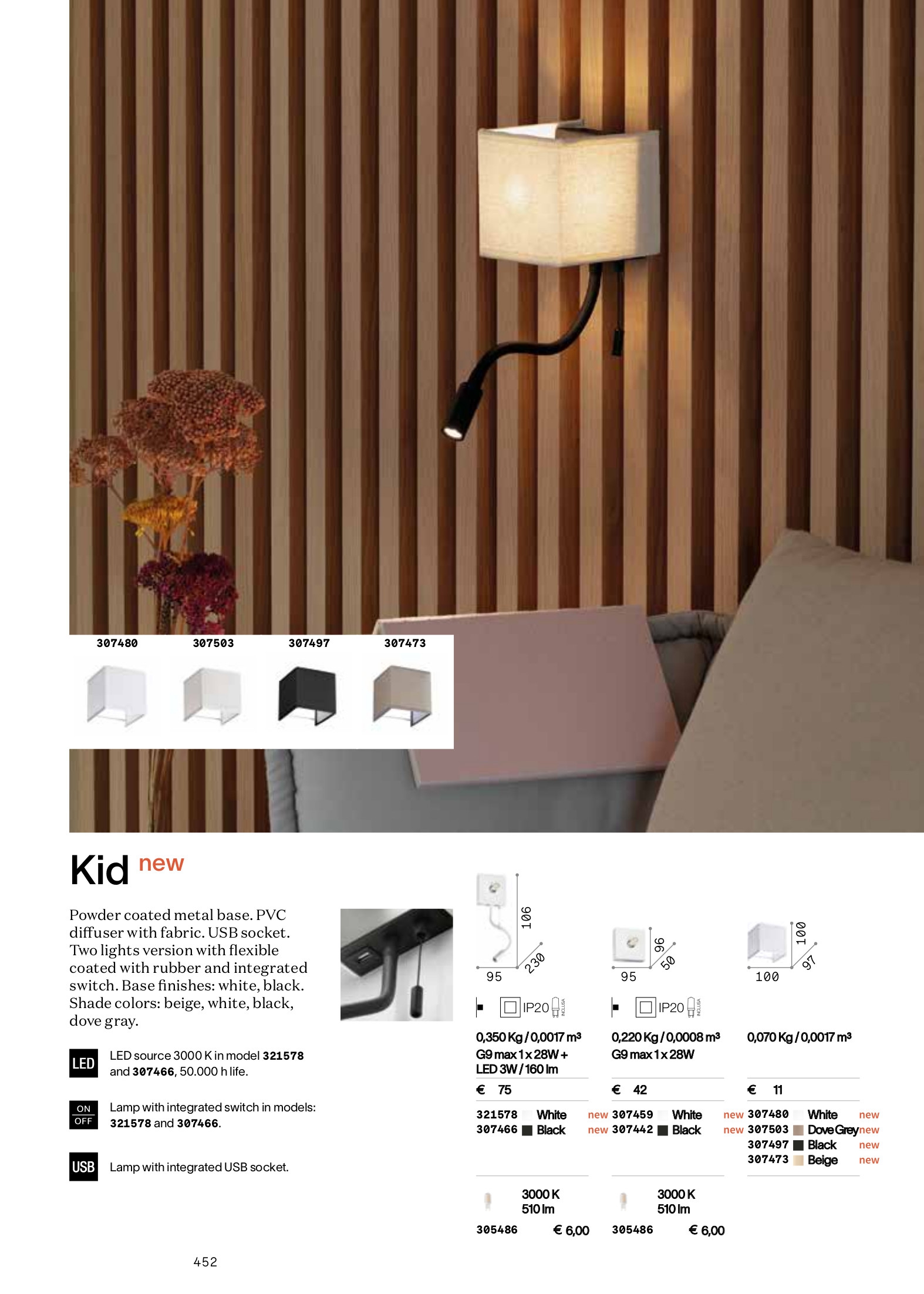 метал с прахово нанесено покритие в черен цвят, USB порт, абажурът в цвят черно, бяло, бежово и гълъбово сиво е опция и се купува отделно