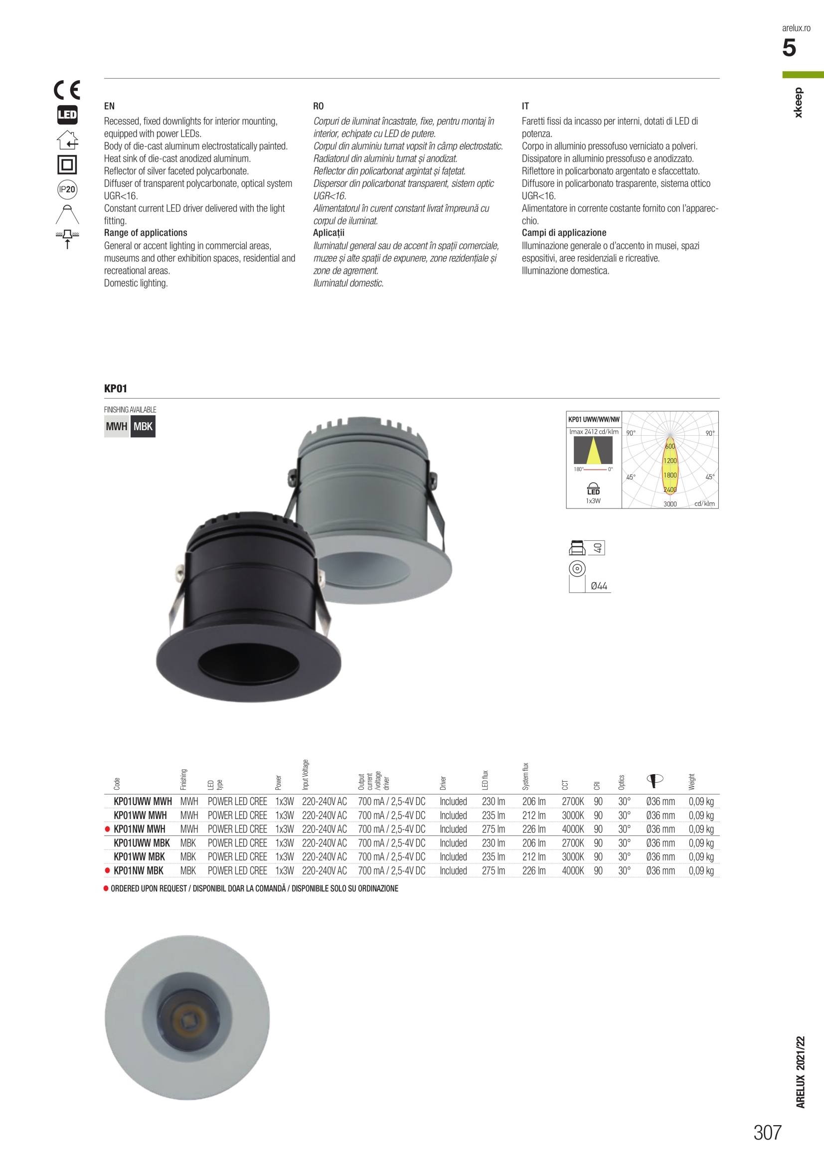 Лед луничка / луна KP01WW MBK ще осигури комфорт и естетика във всяко помещение, в което се постави. Цялостната визия и дизайн на led лампата и вложените в изработката й материали, като лят алуминий с електростатично нанесено покритие в цвят черен мат, охлаждащ радиатор от анодизиран алуминий, рефлектор от сребрист фасетиран поликарбонат, ще допринесат за един неповторим стил. Благодарение на дългогодишния опит в производството на лед осветление, качествените материали и строгия контрол на качеството на изработка на дизайнерската линия Redo Arelux на производителя Redo (Румъния), KP01WW MBK е на високо европейско ниво.