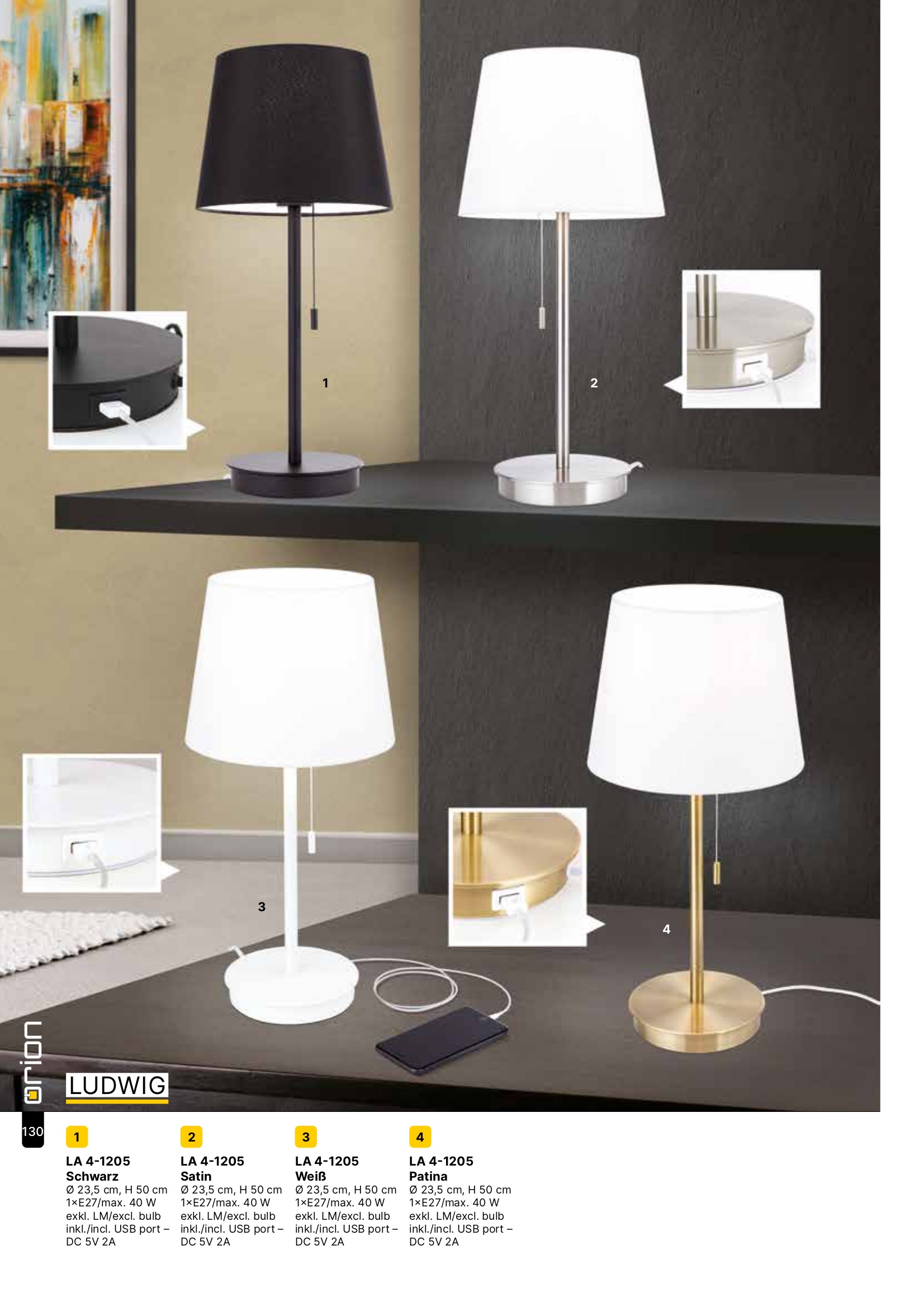 Осветителното тяло LA 4-1205/1 satin (1xE27) ще осигури комфорт и естетика във всяко помещение, в което се постави. Цялостната визия и дизайн на лампата и вложените в изработката й материали, като стомана в цвят хром сатен, абажур от текстил в бяло, USB порт (DC 5V, 2A), превключвател - въженце, ще допринесат за един неповторим стил. Благодарение на дългогодишния опит, качествените материали и строгия контрол на качеството на изработка на производителя Orion (Австрия), LA 4-1205/1 satin (1xE27) е на високо европейско ниво.