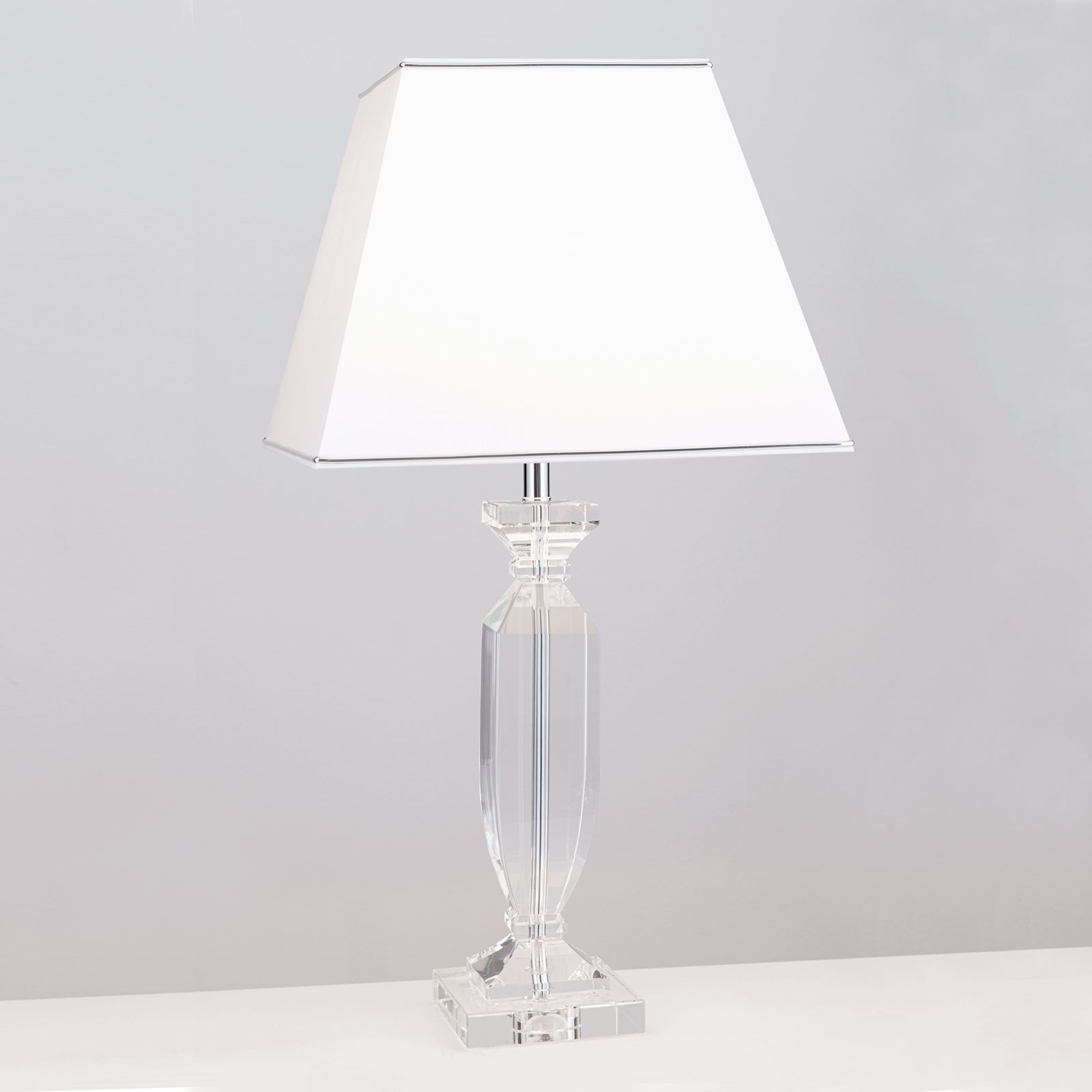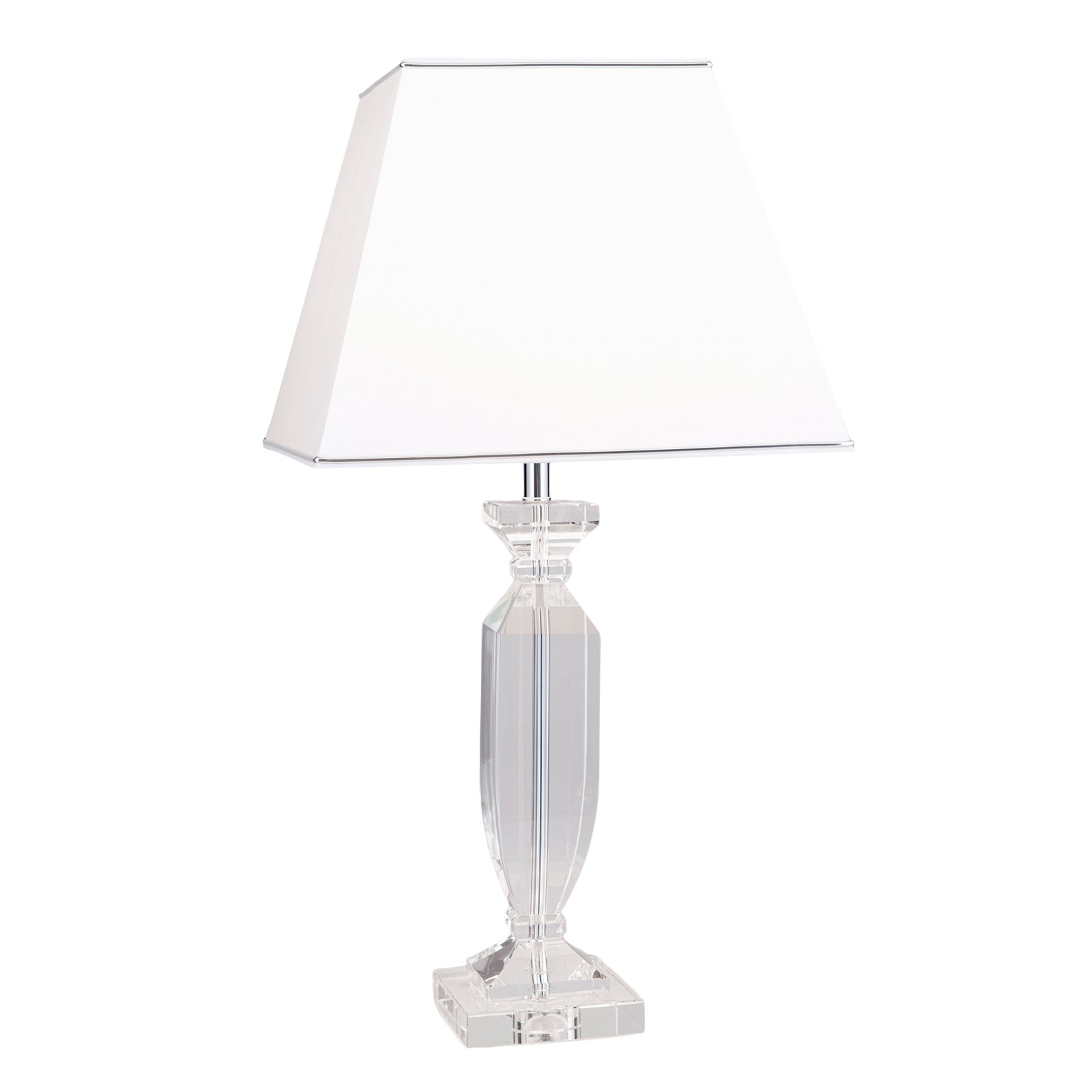 кристално стъкло К9, абажур от текстил в бял цвят със сребристи ивици, метал в цвят сребро
