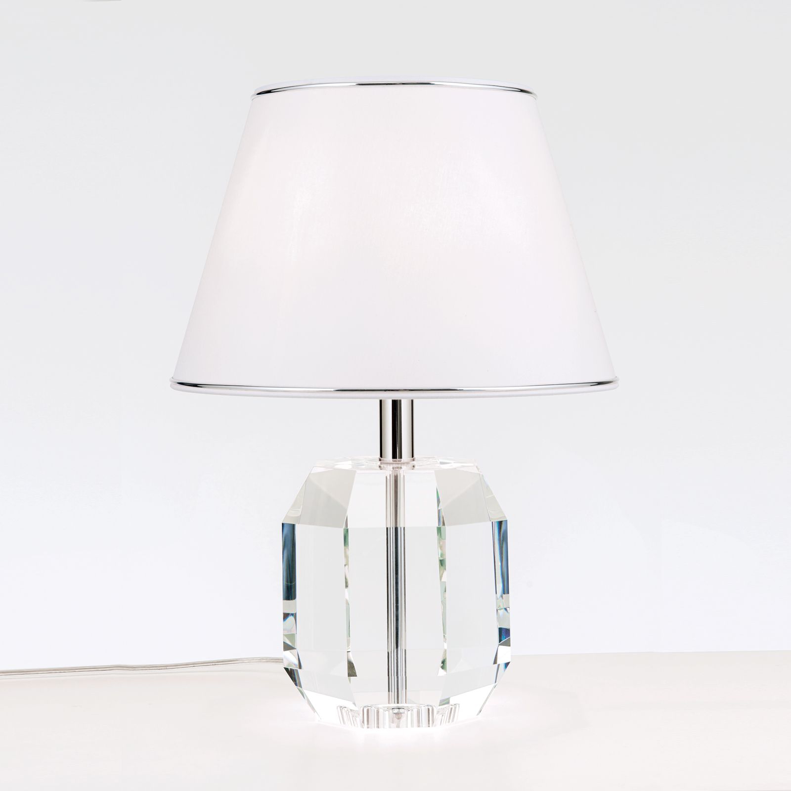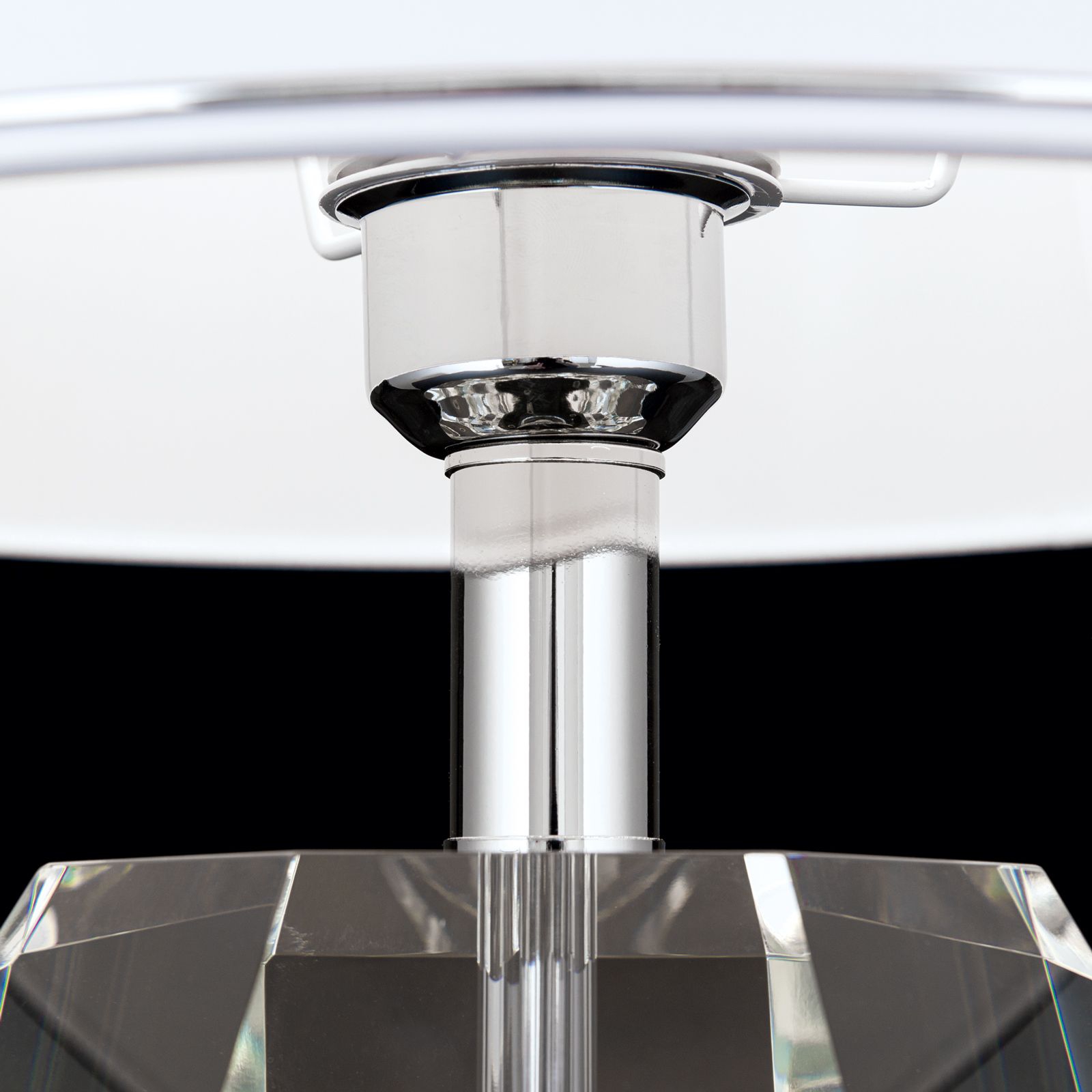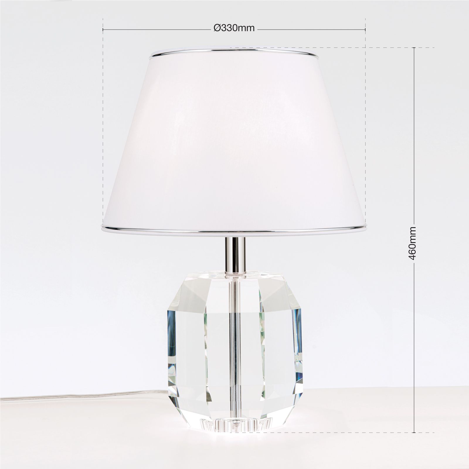 кристално стъкло К9, абажур от текстил в бял цвят със сребристи ивици, метал в цвят сребро