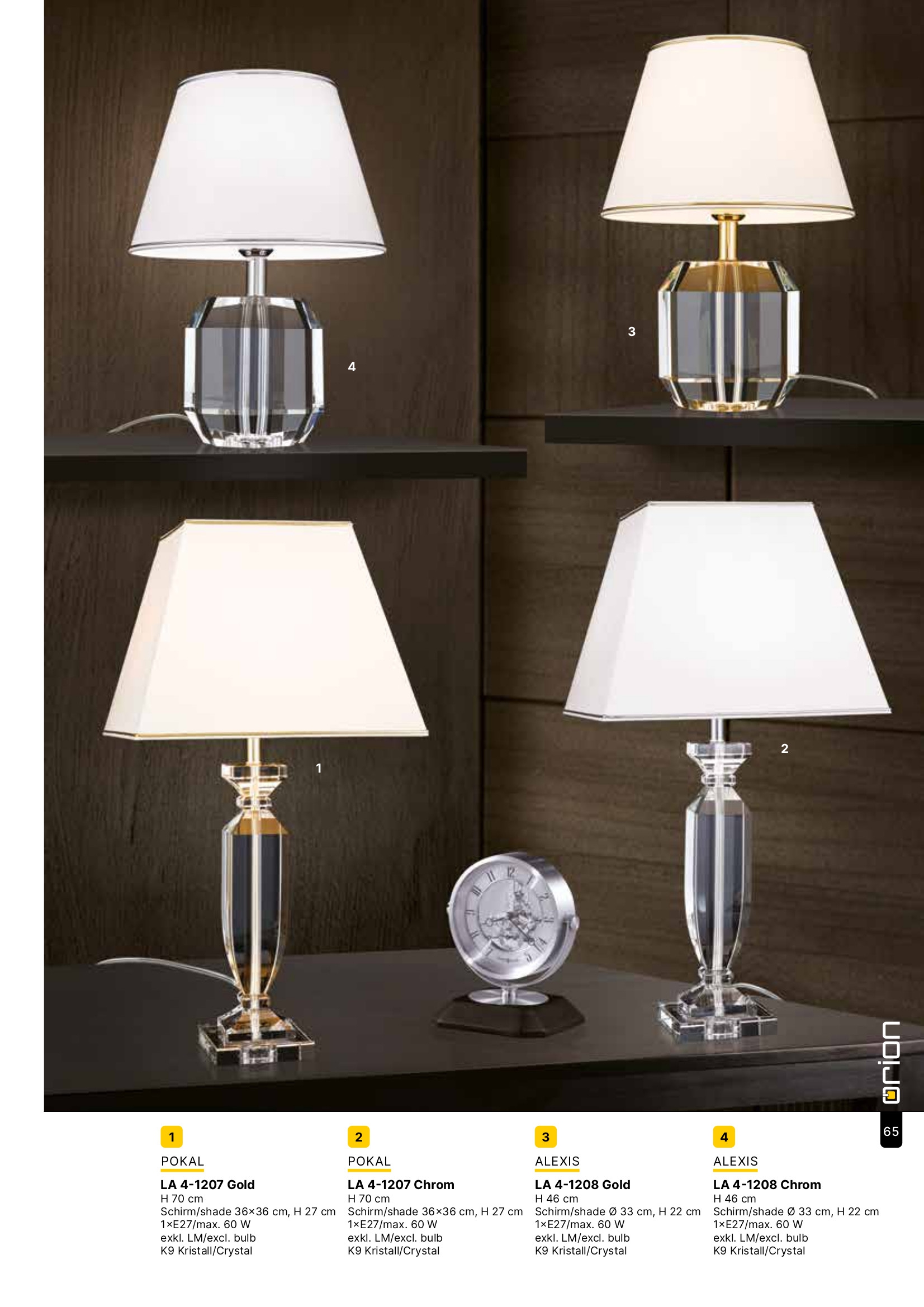 Осветителното тяло LA 4-1208 chrom (1xE27) ще осигури комфорт и естетика във всяко помещение, в което се постави. Цялостната визия и дизайн на лампата и вложените в изработката й материали, като кристално стъкло К9, абажур от текстил в бял цвят със сребристи ивици, метал в цвят сребро, ще допринесат за един неповторим стил. Благодарение на дългогодишния опит, качествените материали и строгия контрол на качеството на изработка на производителя Orion (Австрия), LA 4-1208 chrom (1xE27) е на високо европейско ниво.