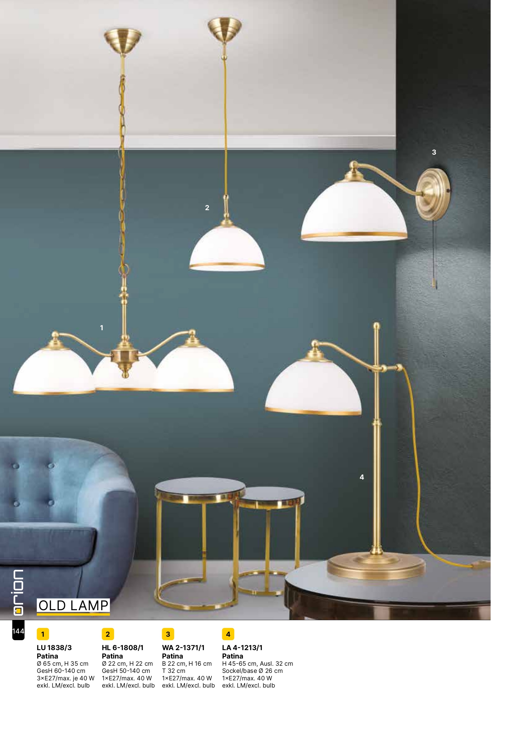 Магазини за за осветителни тела ОРИОН представят осветителното тяло LA 4-1213/1 Patina (1xE27), което представлява настолна лампа, съдадено в класически стил. Като представител на категорията това осветително тяло е подходящо за различни помещения и пространства във Вашия дом или офис, като препоръчваме използването му, например за всекидневна / хол, спалня, трапезария, офис.