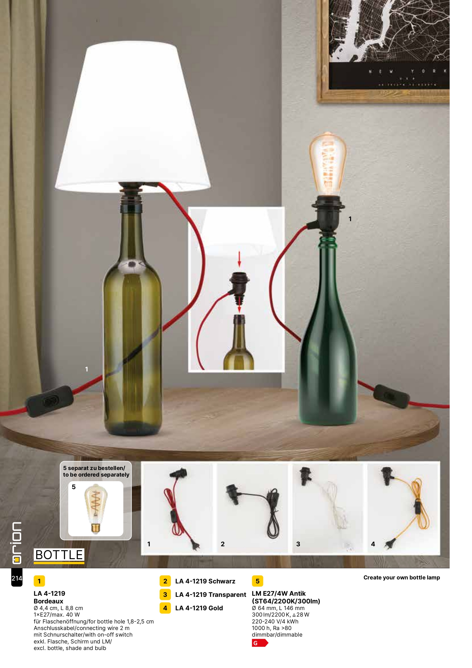 Осветителното тяло LA 4-1219 schwarz (1xE27/max. 40W) ще осигури комфорт и естетика във всяко помещение, в което се постави. Цялостната визия и дизайн на лампата и вложените в изработката й материали, като захранващ кабел от полимер с щепсел и ключ в черен цвят с дължина 2m, държач за лампа от поликарбонат в черно, за бутилка или друг съд с ширина на гърлото от 18 до 25mm (бутилката, лампата и абажура не са включени в комплекта), ще допринесат за един неповторим стил. Благодарение на дългогодишния опит, качествените материали и строгия контрол на качеството на изработка на производителя Orion (Австрия), LA 4-1219 schwarz (1xE27/max. 40W) е на високо европейско ниво.