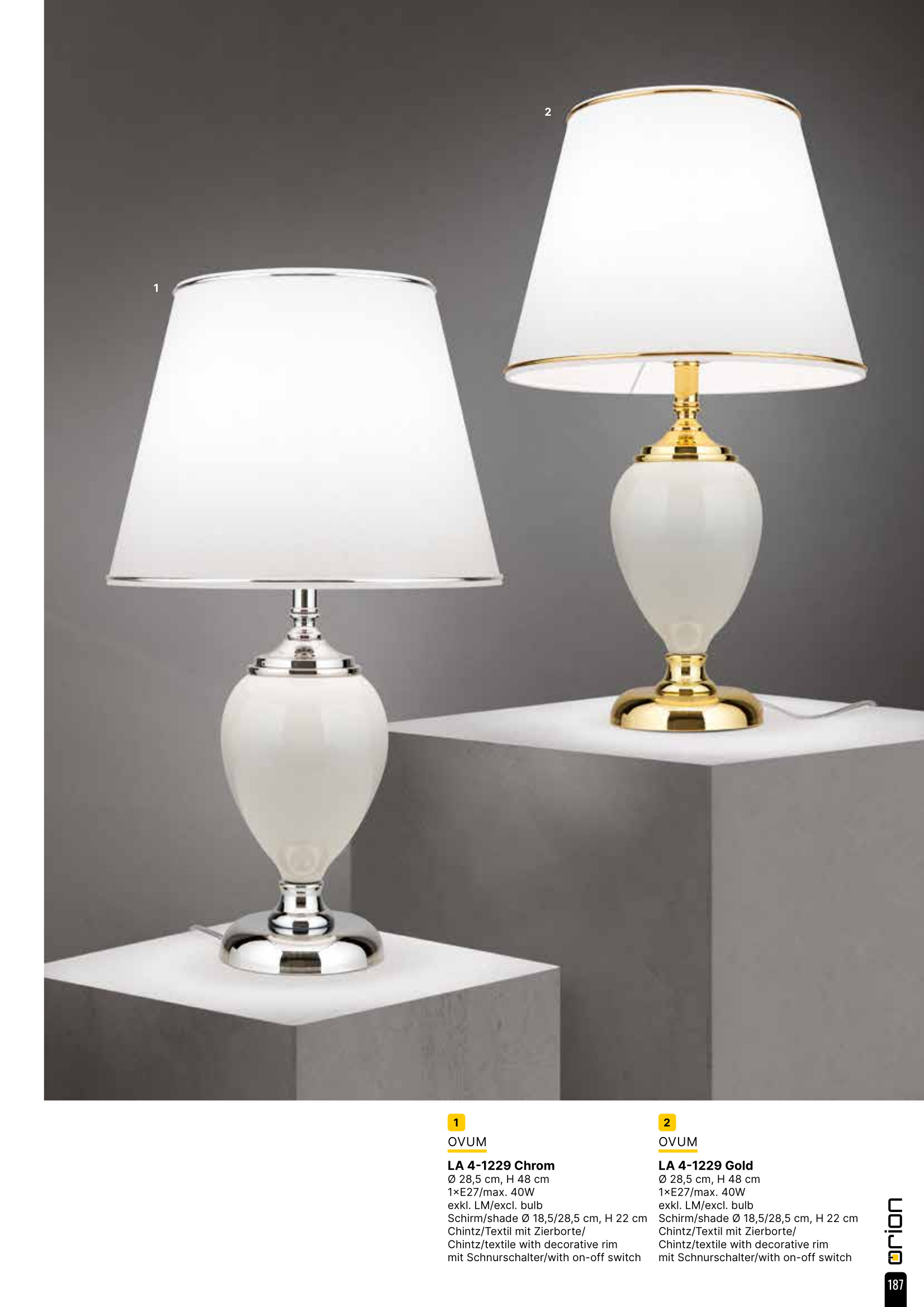 Стилът и естетиката на интериора ще се обогатят благодарение, както на цялостната визия, стил и дизайн на осветителното тяло, така и на вложените от производителя в изработката на LA 4-1229 chrom (1xE27), качествени материали, като: метал в цвят хром, керамика в цвят блестящо бяло, текстил в бяло, превключвател ON/OFF на кабела.