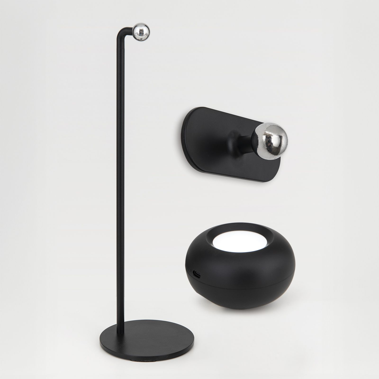 метал в черно, поликарбонат в бяло, ССТ 3000/4000/5700K, Li-ion акумулаторна батерия, може да се използва като настолна лампа или аплик, USB-C към USB 2.0 захранващ кабел 1m, димер с докосване 10-100%