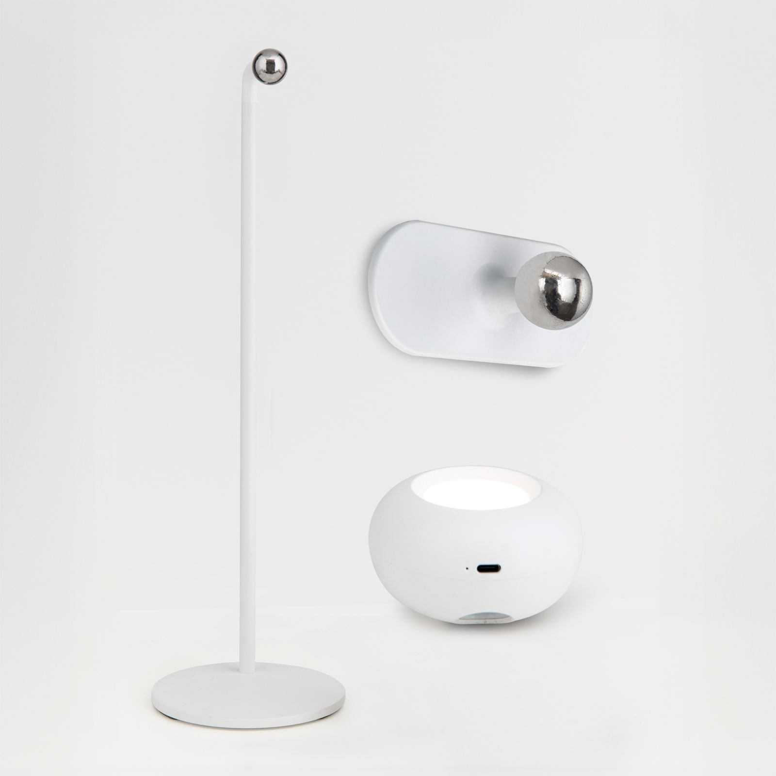 метал в бяло, поликарбонат в бяло, ССТ 3000/4000/5700K, Li-ion акумулаторна батерия, може да се използва като настолна лампа или аплик, USB-C към USB 2.0 захранващ кабел 1m, димер с докосване 10-100%