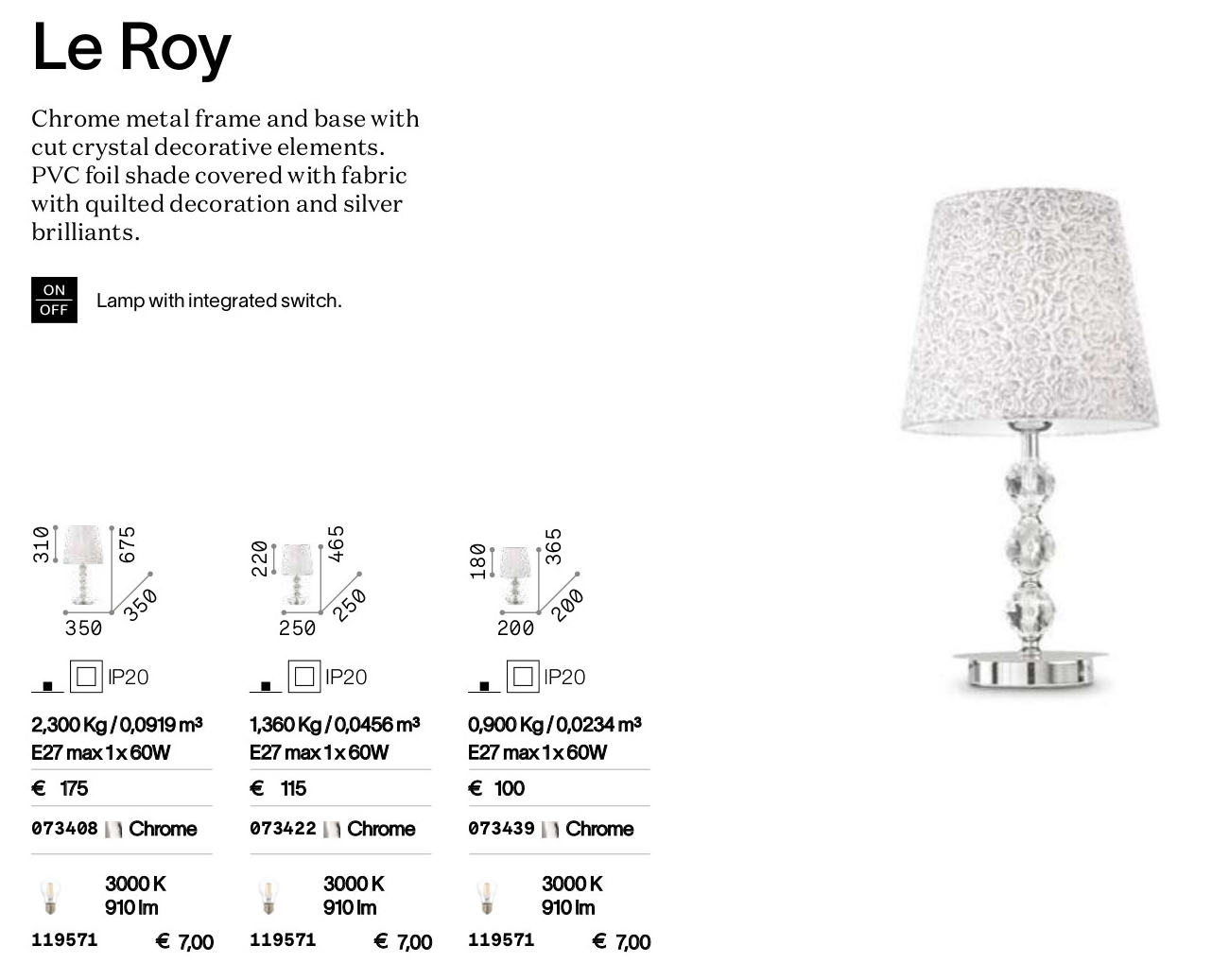 Стилът и естетиката на интериора ще се обогатят благодарение, както на цялостната визия, стил и дизайн на осветителното тяло, така и на вложените от производителя в изработката на LE ROY TL1 SMALL, качествени материали, като: хромирана метална рамка и основа с шлифовани кристални декоративни елементи, абажур от PVC фолио, покрит с плат с капитонирана декорация и сребристи орнаменти, захранващ кабел, ключ и щепсел.