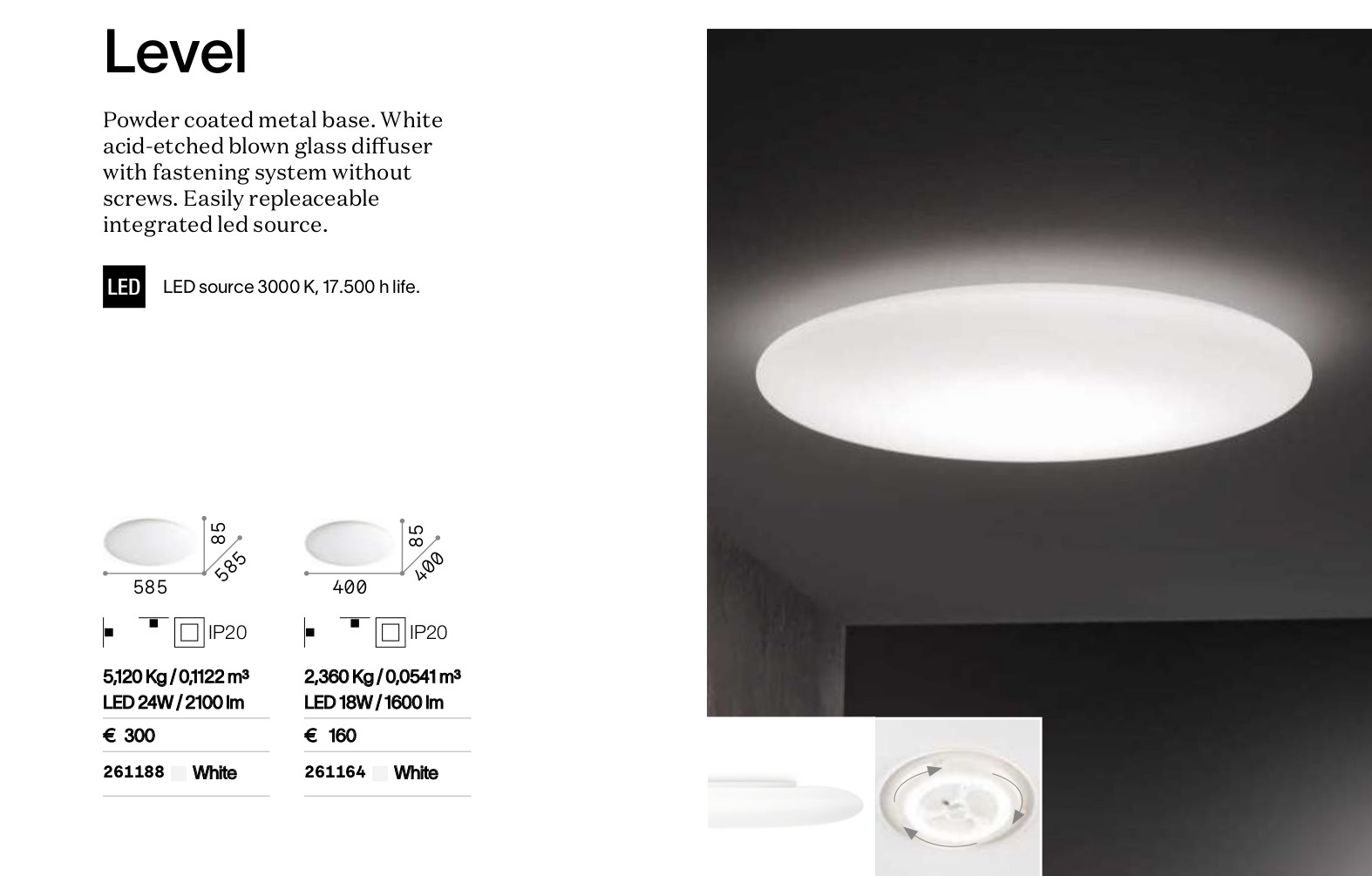 Осветителното тяло LEVEL PL D60 ще осигури комфорт и естетика във всяко помещение, в което се постави. Цялостната визия и дизайн на лампата и вложените в изработката й материали, като метал с прахово нанесено бяло покритие, дифузер от издухано стъкло ецвано с бяла киселина, закрепване без винтове, сменяем LED източник, ще допринесат за един неповторим стил. Благодарение на дългогодишния опит, качествените материали и строгия контрол на качеството на изработка на производителя Ideal-Lux (Италия), LEVEL PL D60 е на високо европейско ниво.