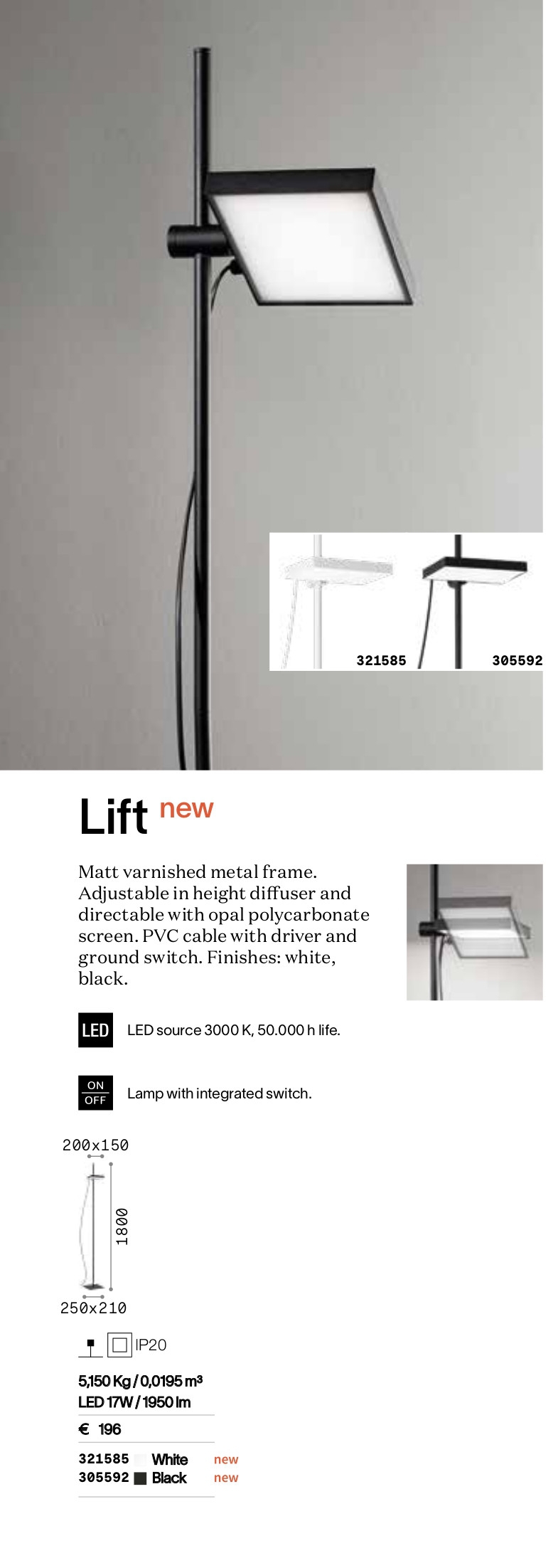 Осветителното тяло LIFT PT NERO ще осигури комфорт и естетика във всяко помещение, в което се постави. Цялостната визия и дизайн на лампата и вложените в изработката й материали, като метал в цвят черен мат, дифузер с регулируема височина и посока на светене от опалово бял поликарбонат, PVC захранващ кабел и интегриран в тялото ключ ON/OFF, ще допринесат за един неповторим стил. Благодарение на дългогодишния опит, качествените материали и строгия контрол на качеството на изработка на производителя Ideal-Lux (Италия), LIFT PT NERO е на високо европейско ниво.