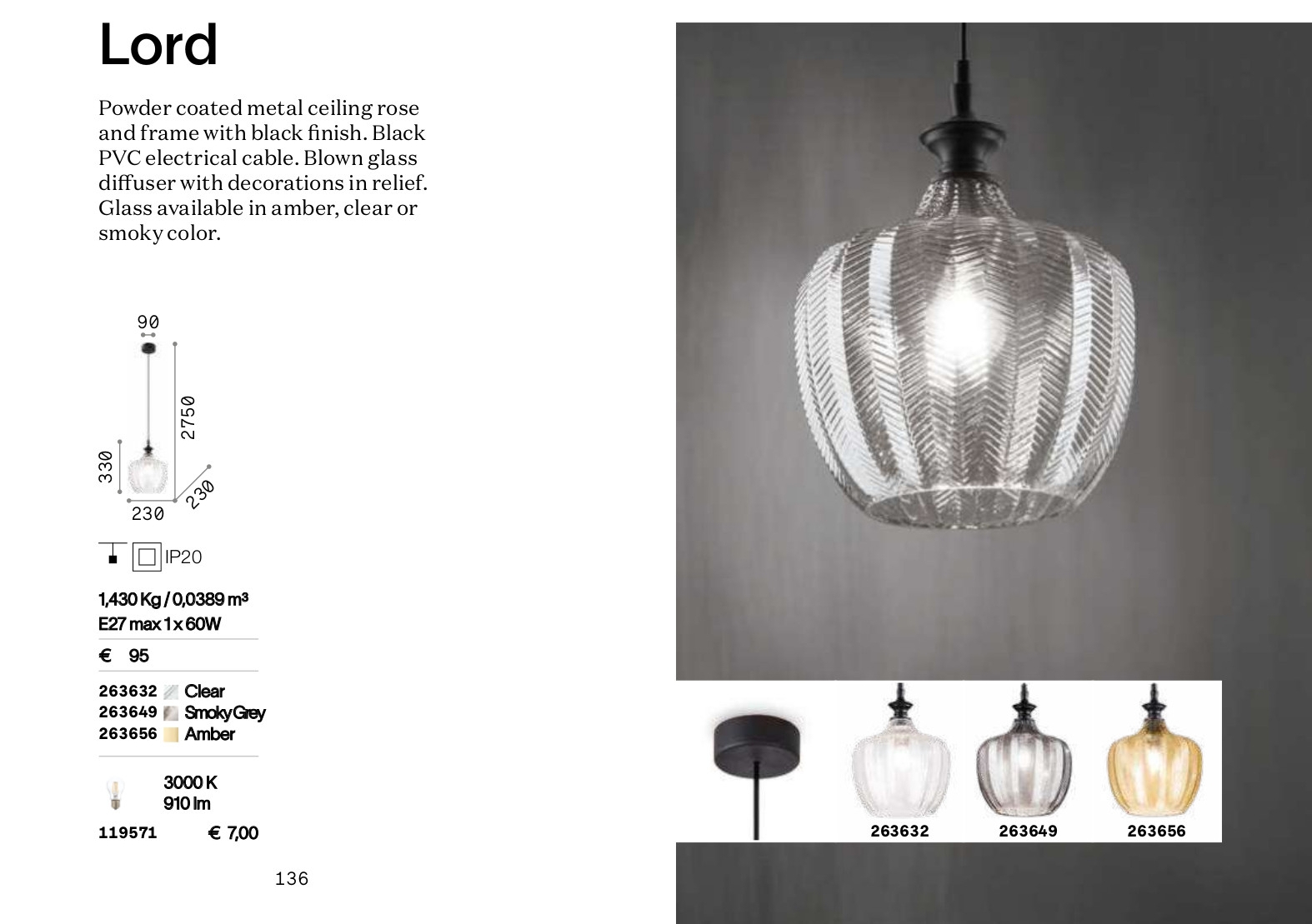 Осветителното тяло LORD SP1 FUME' ще осигури комфорт и естетика във всяко помещение, в което се постави. Цялостната визия и дизайн на лампата и вложените в изработката й материали, като метал в черен цвят, прозрачно опушено стъкло с релефни декорации, черен PVC кабел, ще допринесат за един неповторим стил. Благодарение на дългогодишния опит, качествените материали и строгия контрол на качеството на изработка на производителя Ideal-Lux (Италия), LORD SP1 FUME' е на високо европейско ниво.