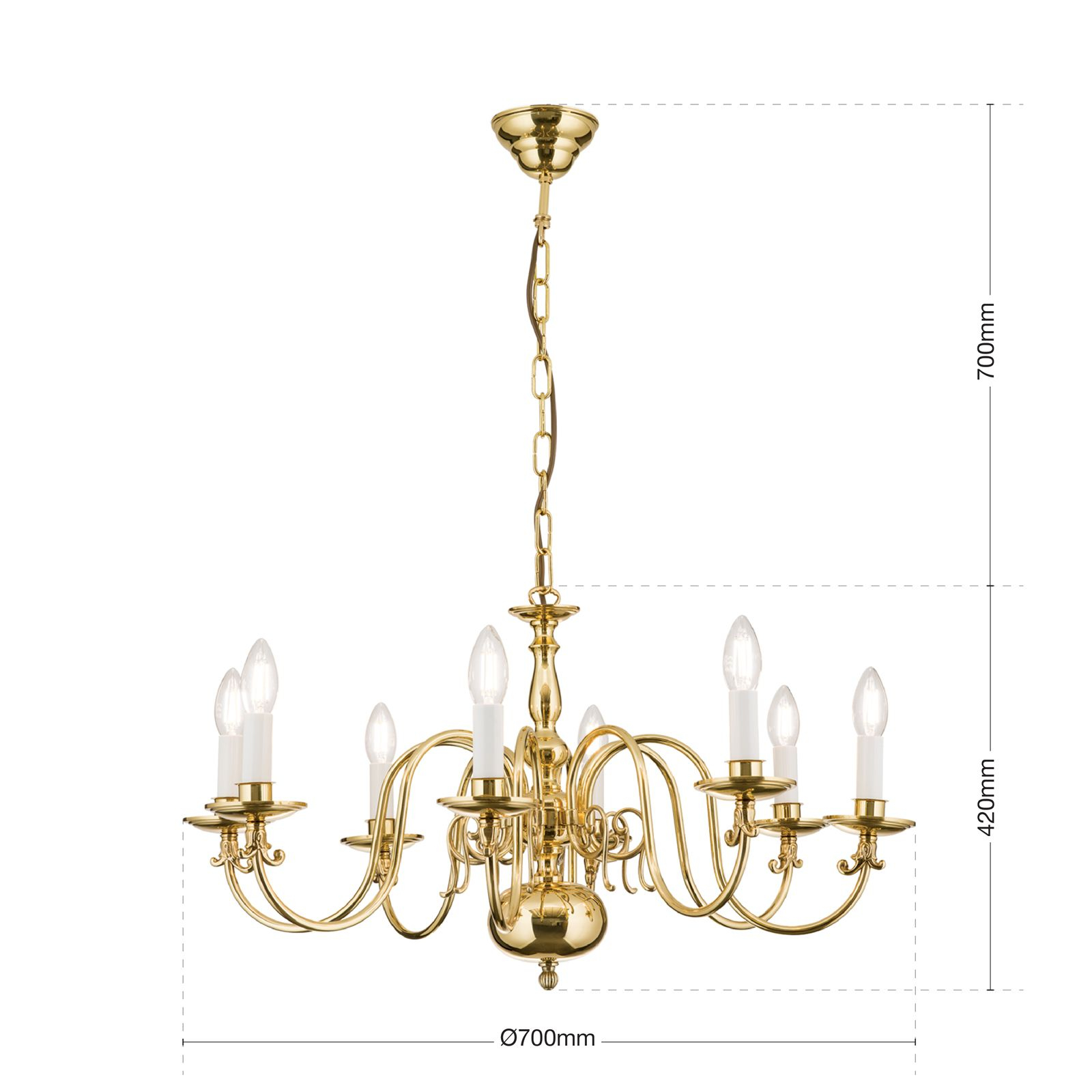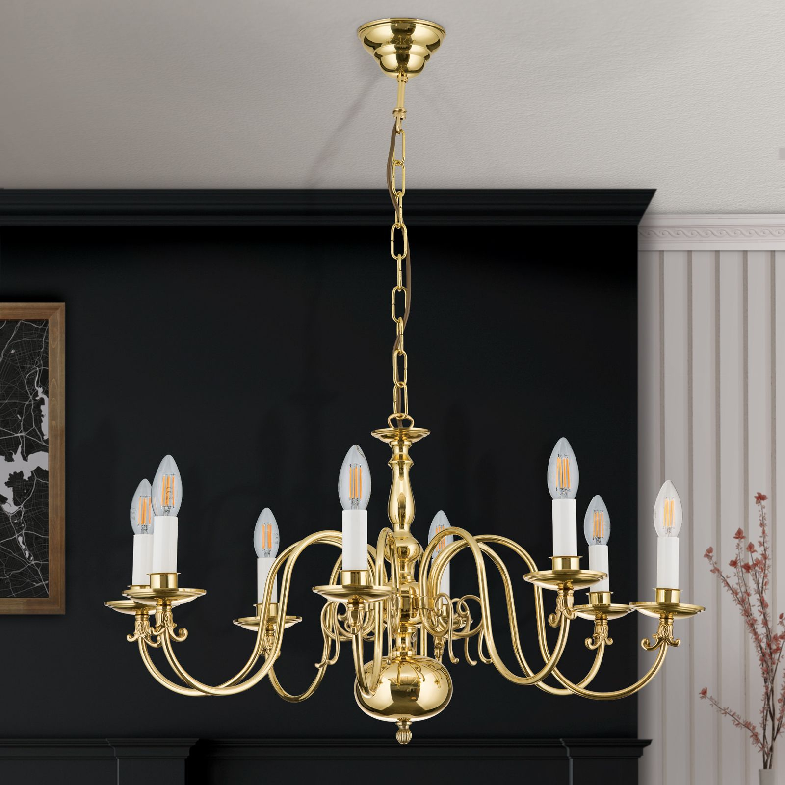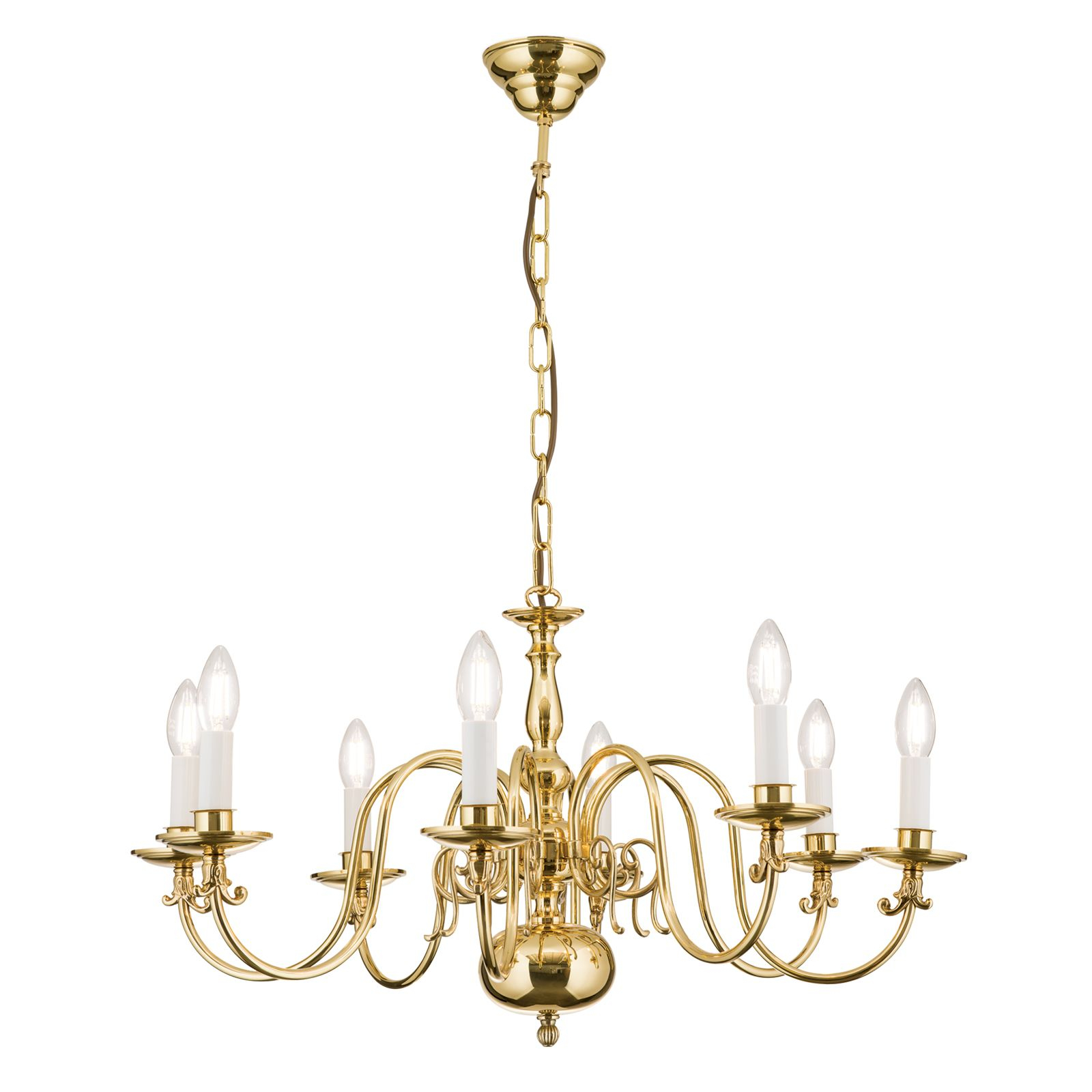 Осветителното тяло LU 1235/8 MS ще осигури комфорт и естетика във всяко помещение, в което се постави. Цялостната визия и дизайн на лампата и вложените в изработката й материали, като масивен месинг с покритие от блестящ месинг във фламандски стил, ще допринесат за един неповторим стил. Благодарение на дългогодишния опит, качествените материали и строгия контрол на качеството на изработка на производителя Orion (Австрия), LU 1235/8 MS е на високо европейско ниво.