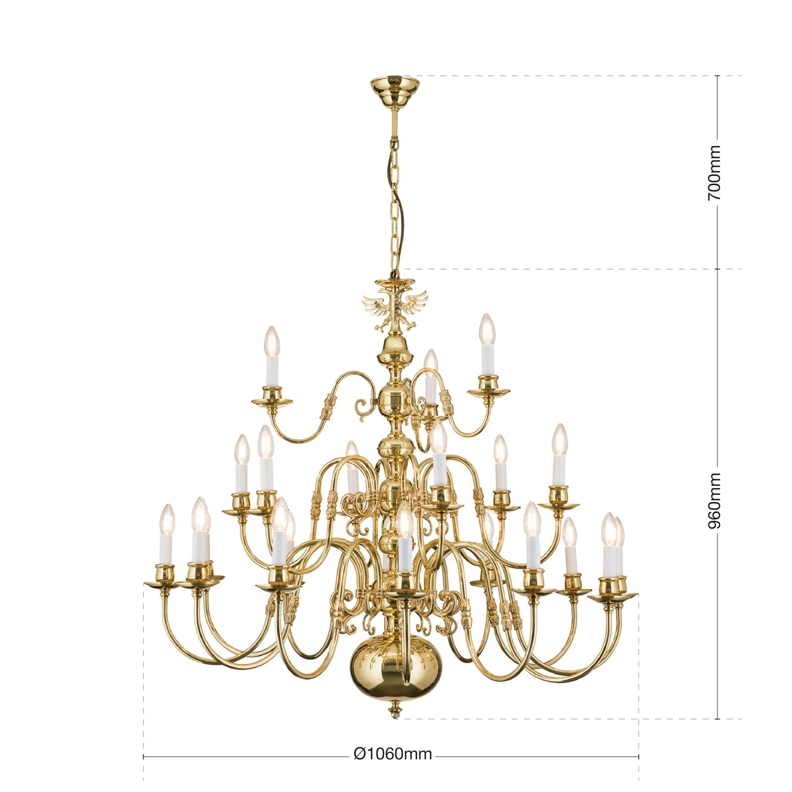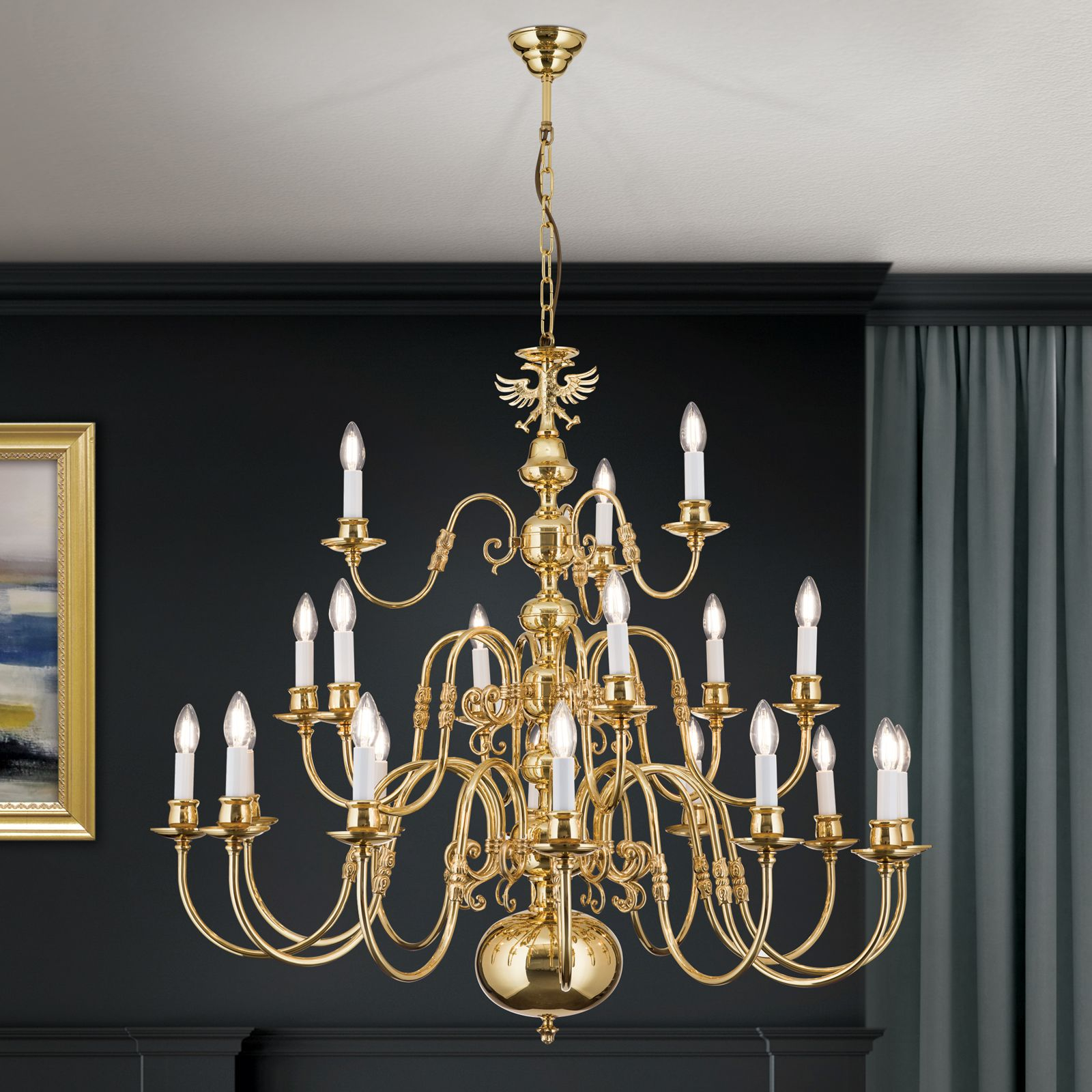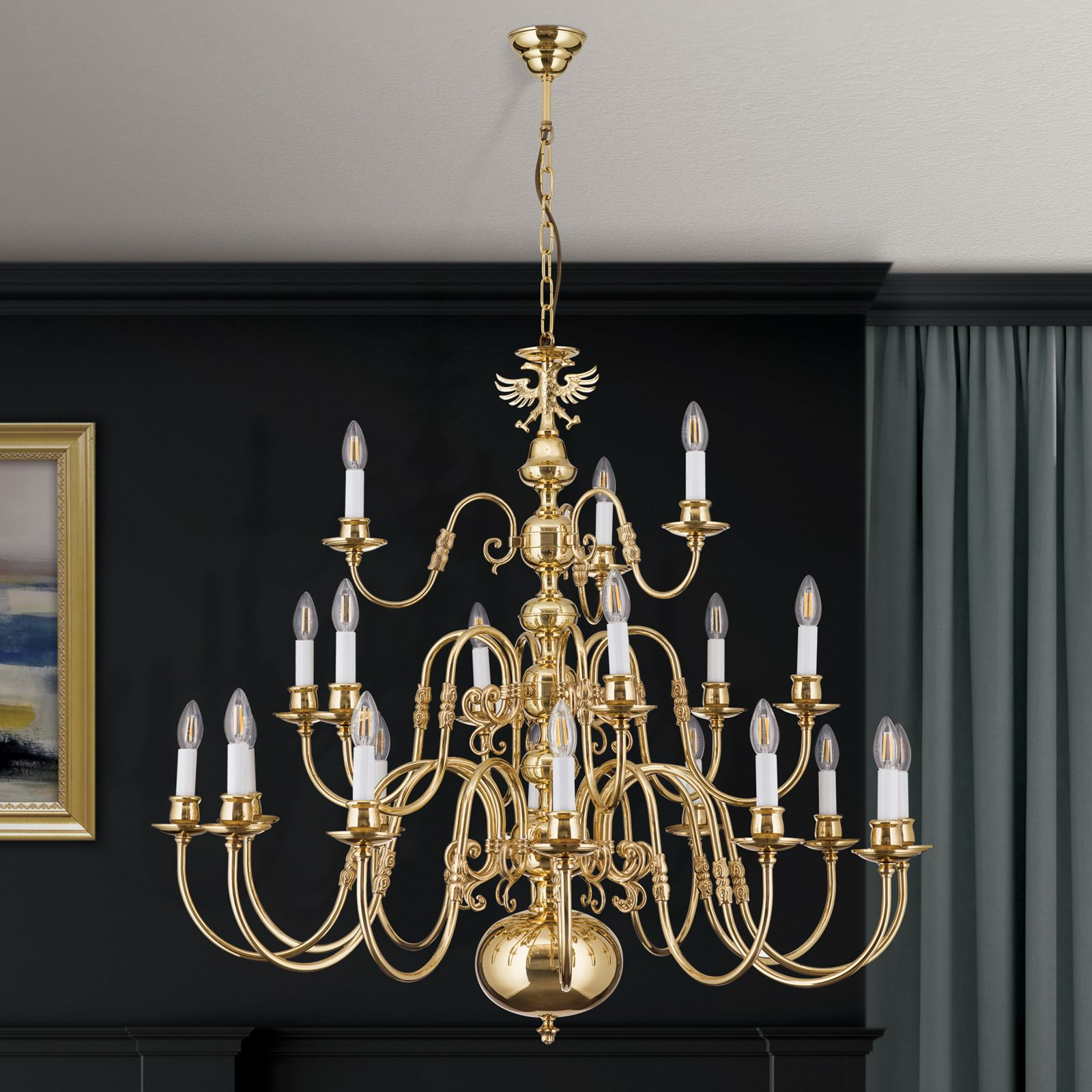 Осветителното тяло LU 1239/12+6+3 MS - mit Adler представлява полилей в класически стил. LU 1239/12+6+3 MS - mit Adler е от категорията осветителни тела и е подходящо за осветяване на различни помещения и пространства като: всекидневна / хол, спалня, кухня, трапезария, офис.