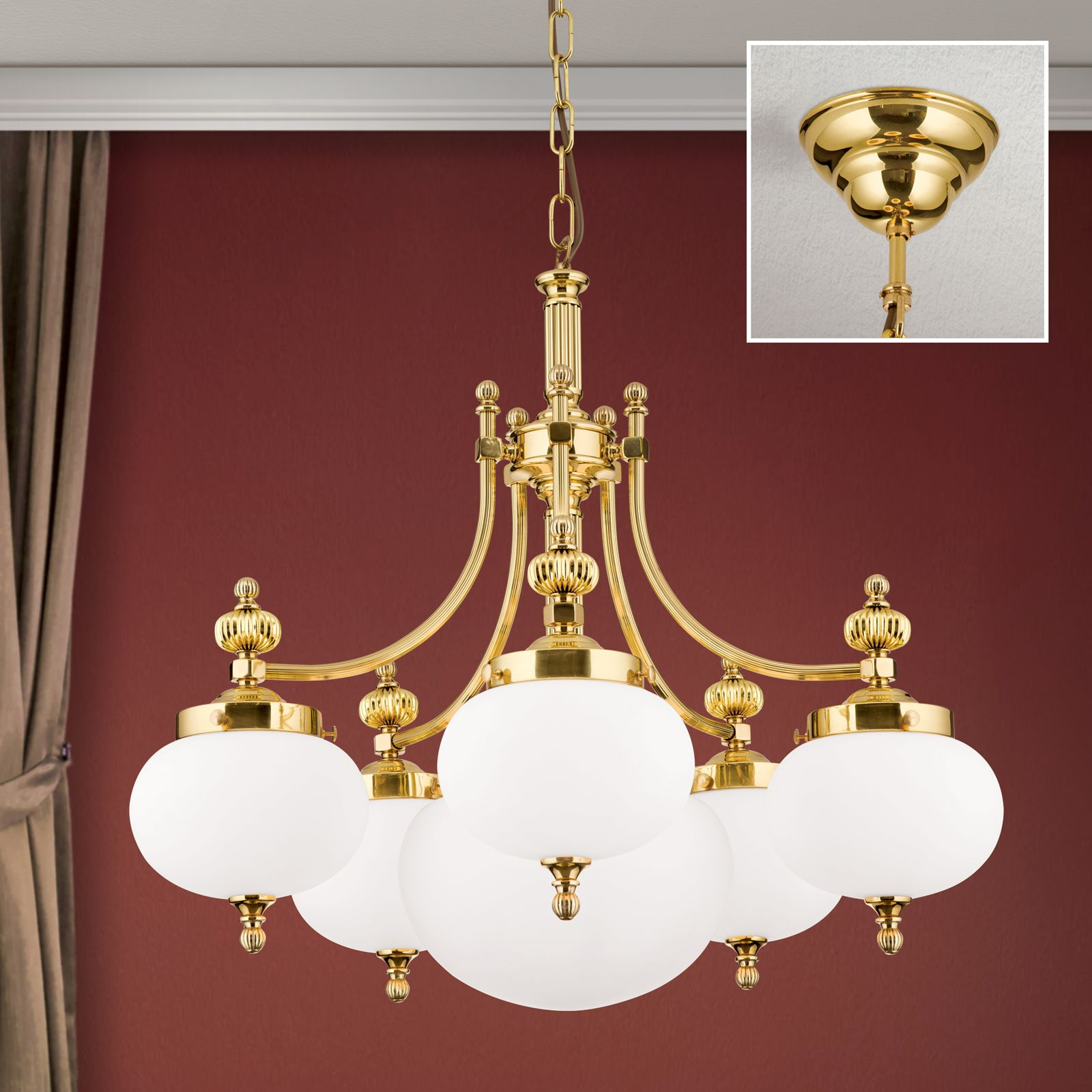За стила и естетиката на интериора допринасят, както цялостната визия и дизайн на осветителното тяло, така и вложените от производителя в изработката висококачествени материали, като масивен месинг с покритие от блестящ месинг, стъкло в цвят бял опал мат.