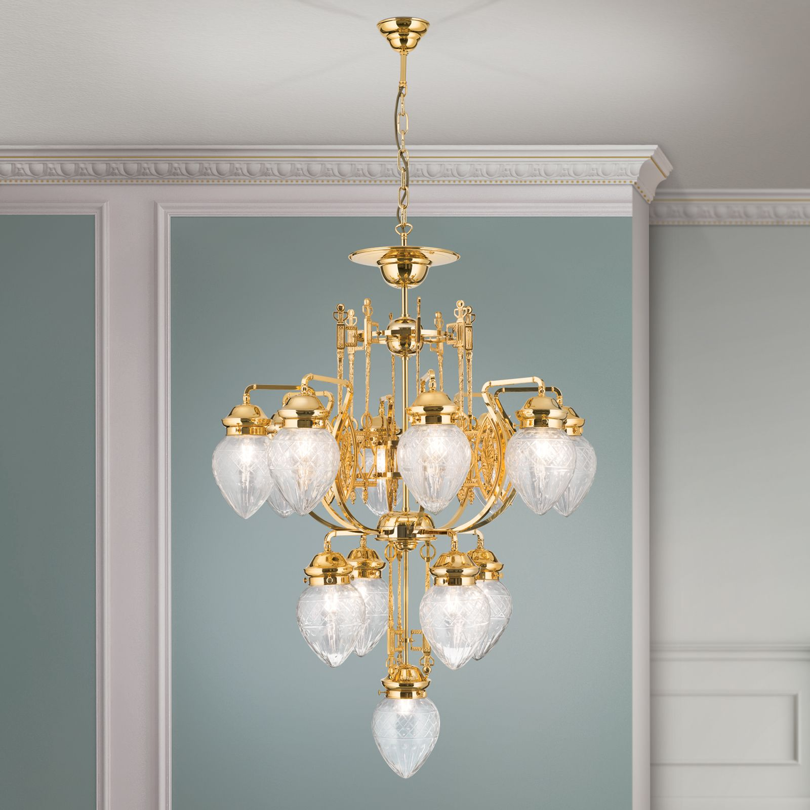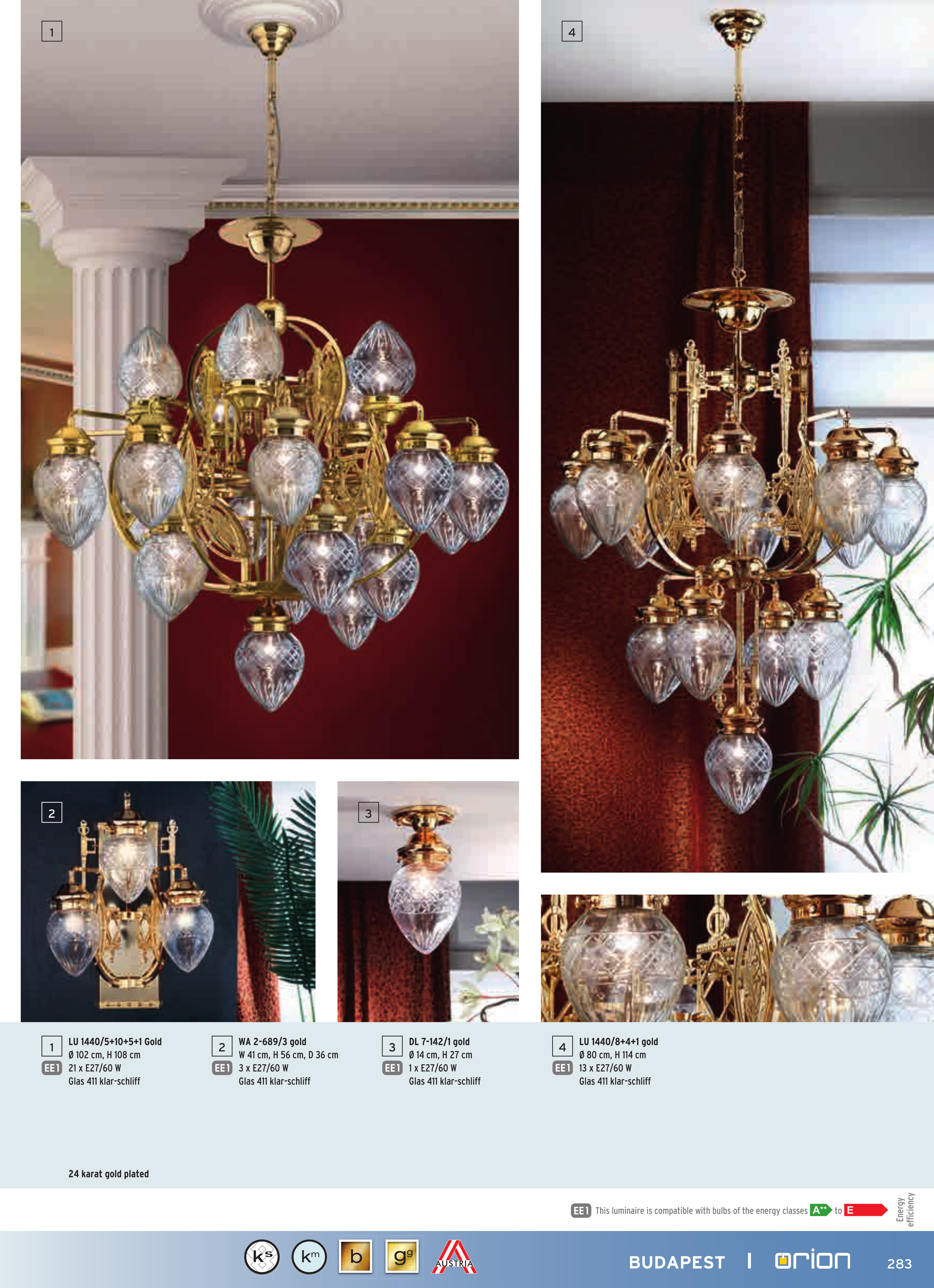 Осветителното тяло LU 1440/8+4+1 gold/411 klar-Schliff ще осигури комфорт и естетика във всяко помещение, в което се постави. Цялостната визия и дизайн на лампата и вложените в изработката й материали, като месинг със златно покритие, прозрачно шлифовано стъкло с релефни линии, ще допринесат за един неповторим стил. Благодарение на дългогодишния опит, качествените материали и строгия контрол на качеството на изработка на производителя Orion (Австрия), LU 1440/8+4+1 gold/411 klar-Schliff е на високо европейско ниво.