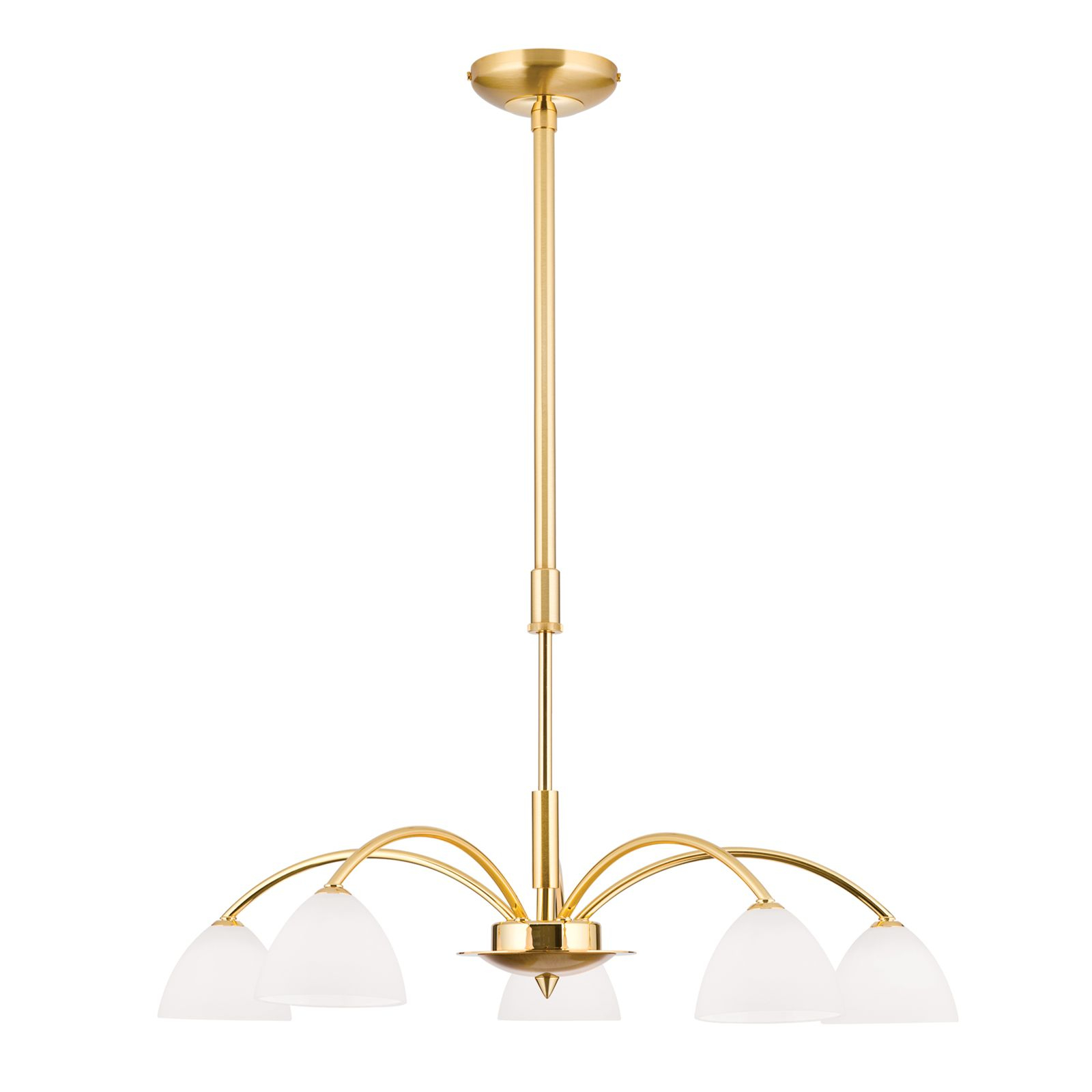 Магазини ОРИОН представят осветителното тяло LU 1599/5 gold-matt/438 opal, което представлява полилей в съвременен стил. Лампата е част от категорията полилеи и е подходяща за различни помещения и пространства, като например всекидневна / хол, спалня, кухня, трапезария, офис.