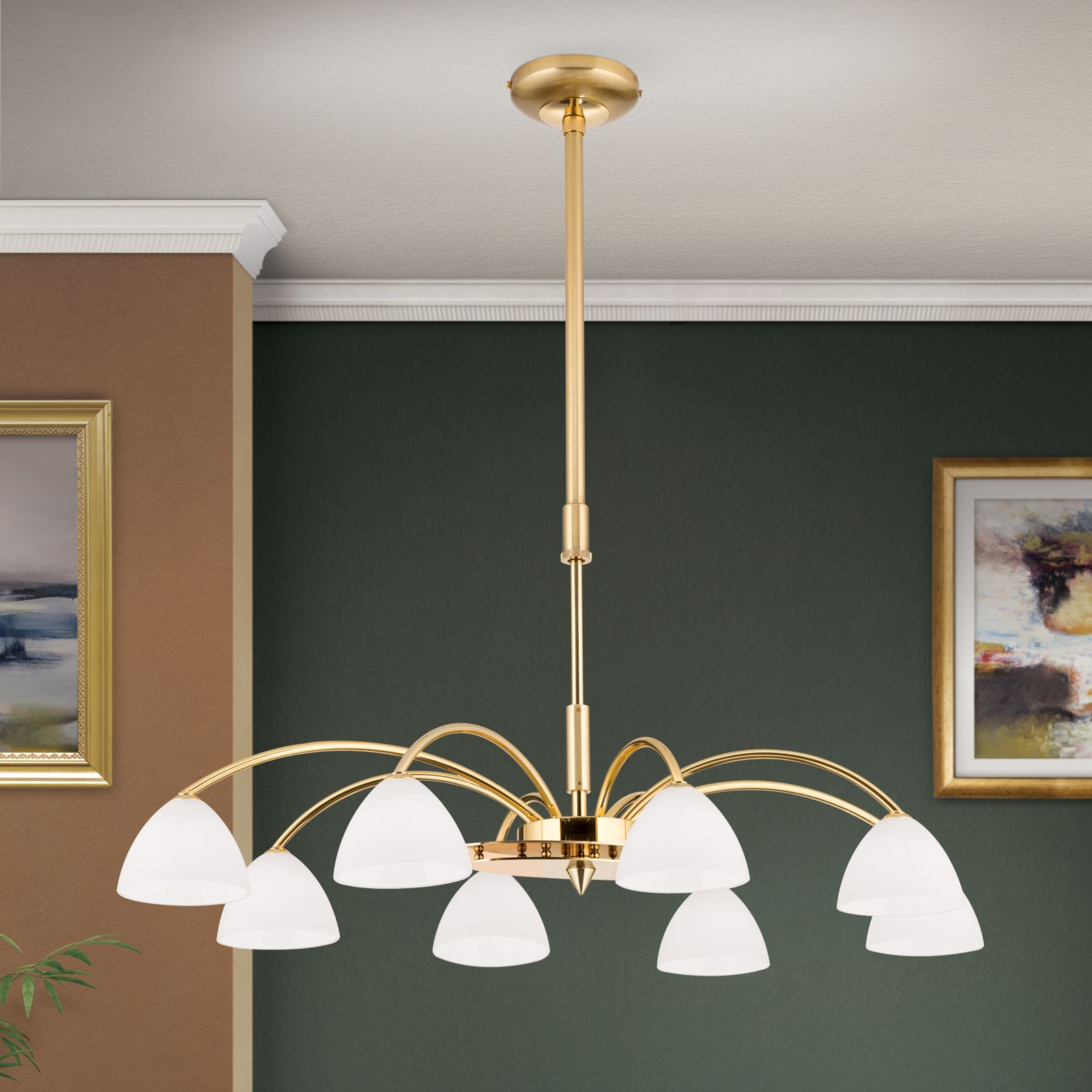 Магазини ОРИОН представят осветителното тяло LU 1599/8 gold-matt/438 opal, което представлява полилей в съвременен стил. Лампата е част от категорията полилеи и е подходяща за различни помещения и пространства, като например всекидневна / хол, спалня, кухня, трапезария, офис.
