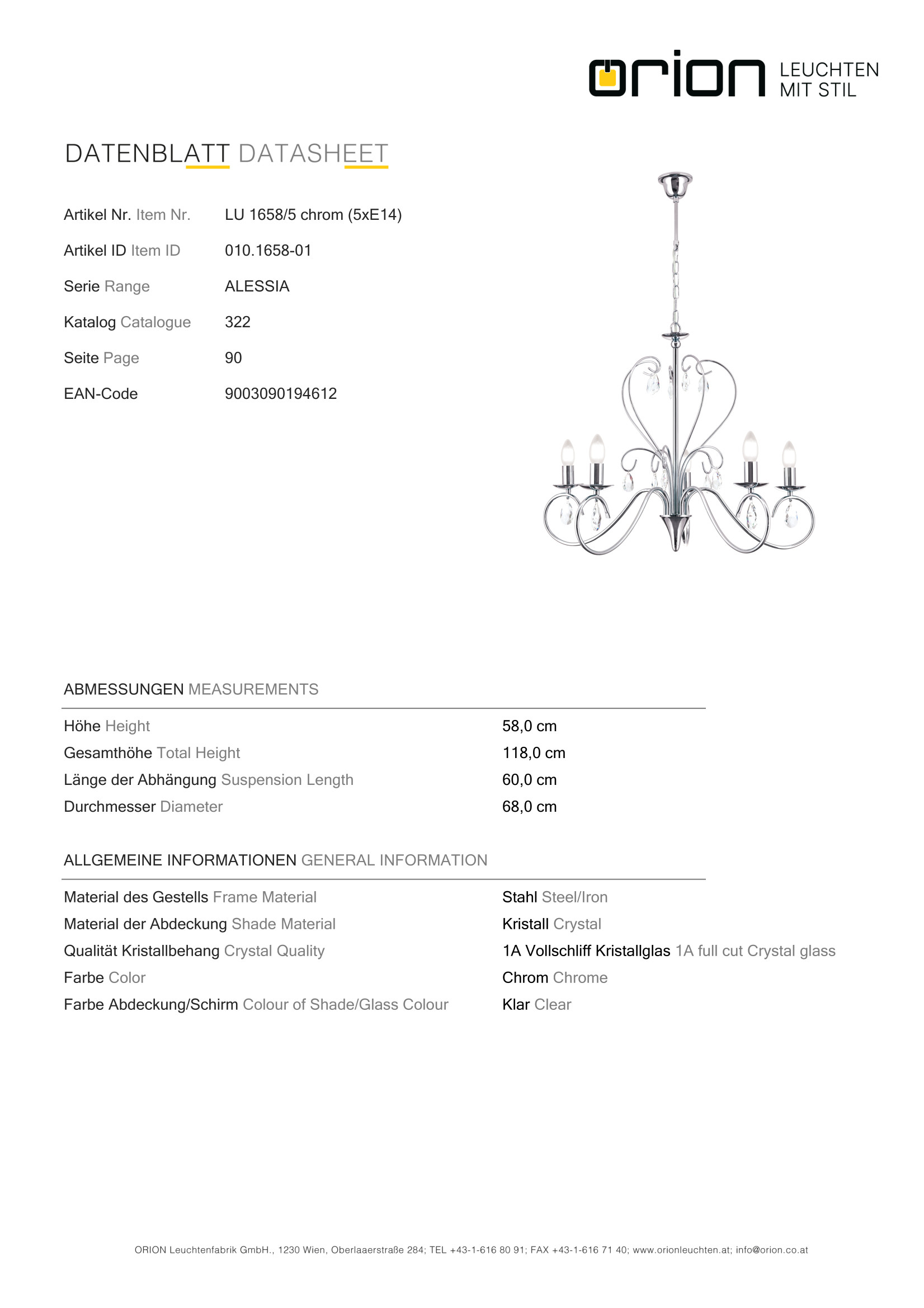Благодарение на дългогодишния успешен опит в областта на производството на лампи на Orion (Австрия), качеството на осветителното тяло е на високо европейско ниво.