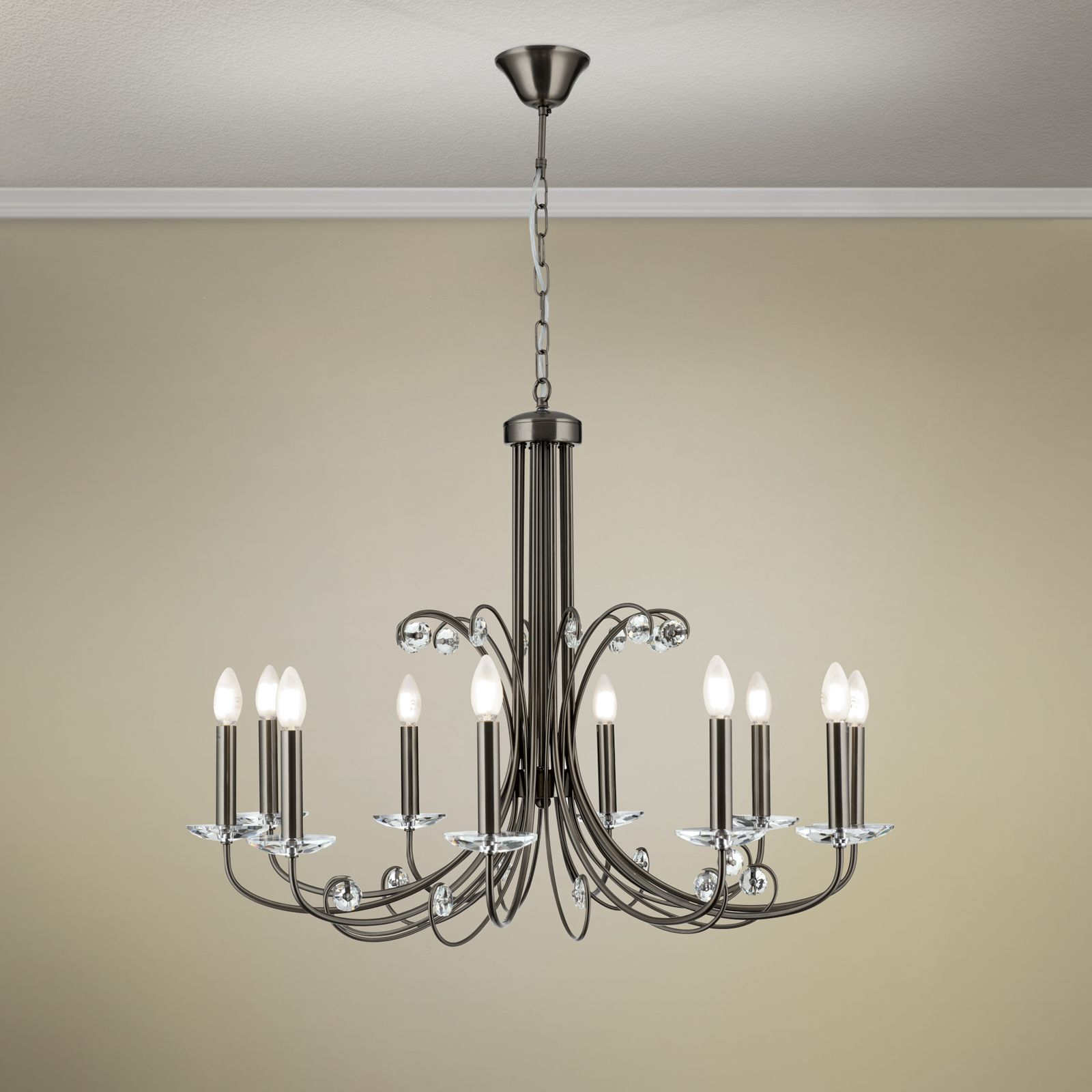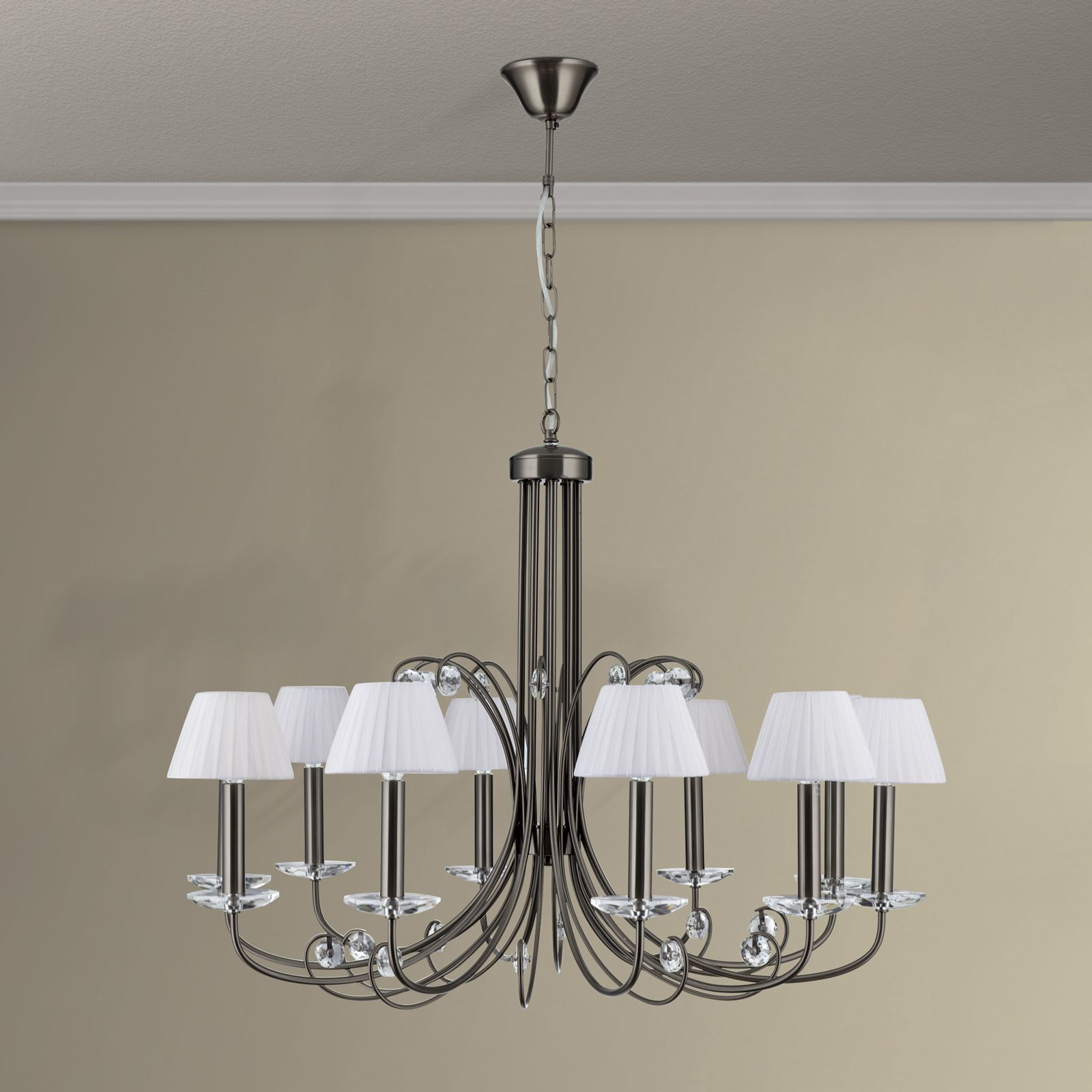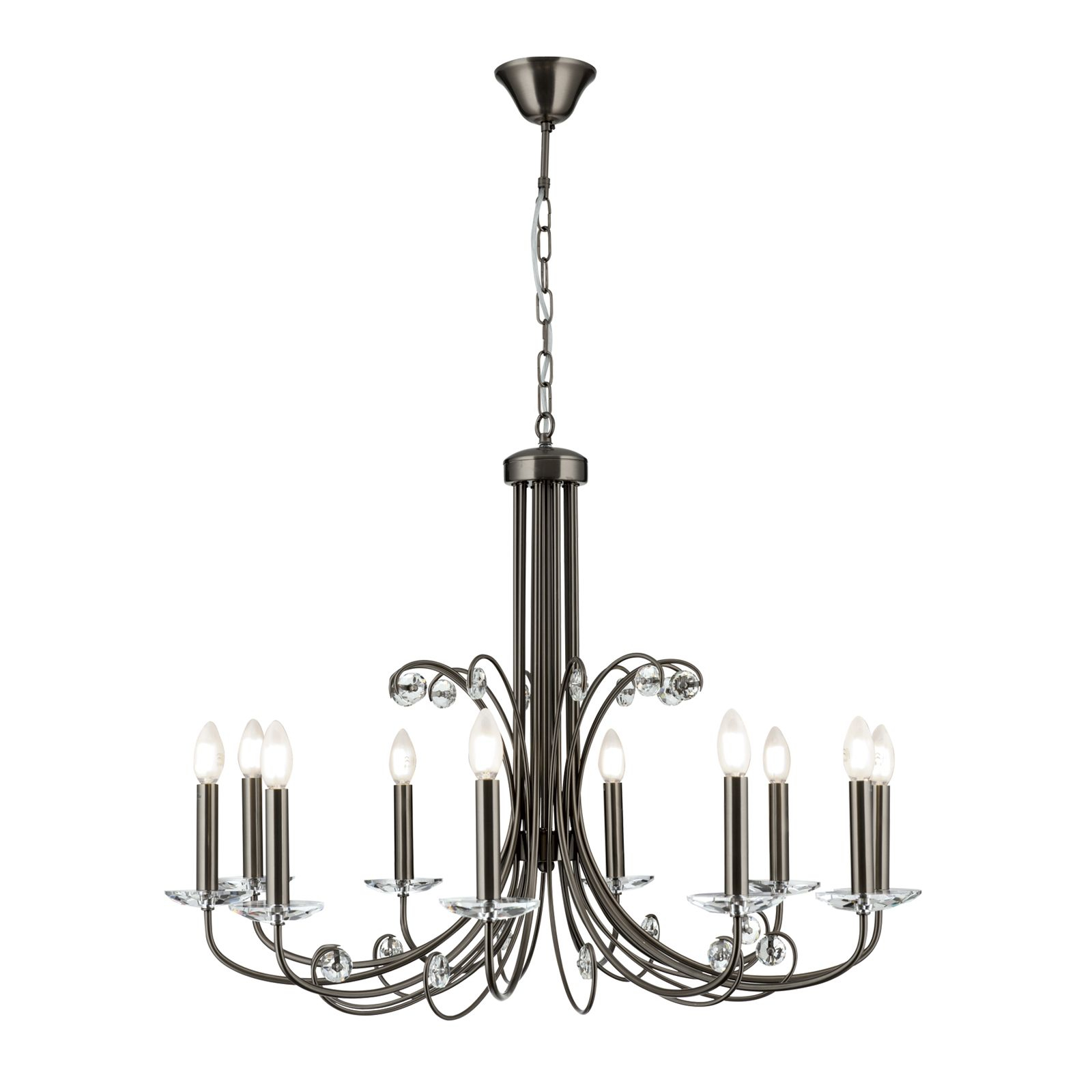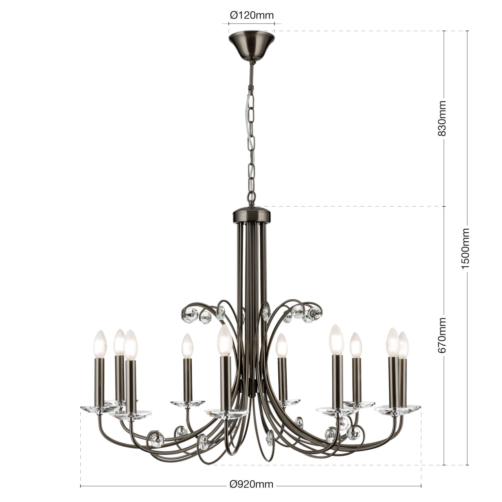 Осветителното тяло LU 1842/10 dark-nickel (10xE14) представлява полилей в класически стил. LU 1842/10 dark-nickel (10xE14) е от категорията осветителни тела и е подходящо за осветяване на различни помещения и пространства като: всекидневна / хол, спалня, кухня, трапезария, офис.